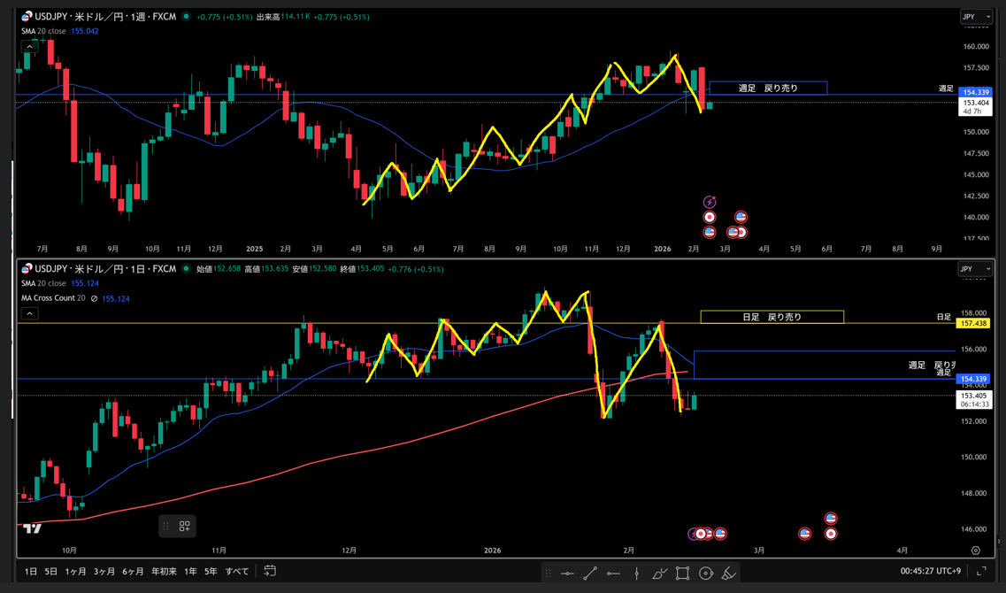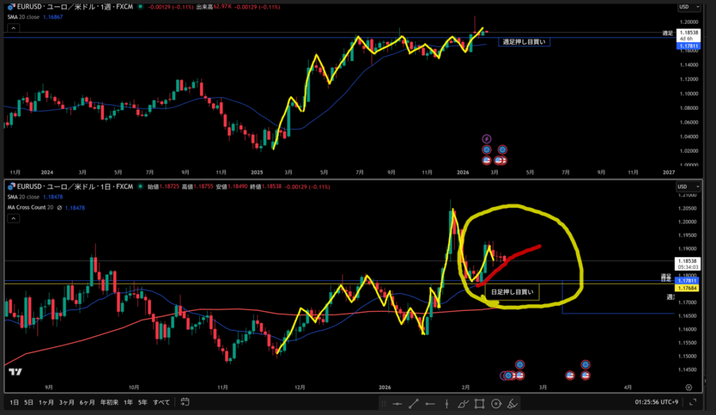 黄色水平線の上に日足の戻り売り勢力がいる。