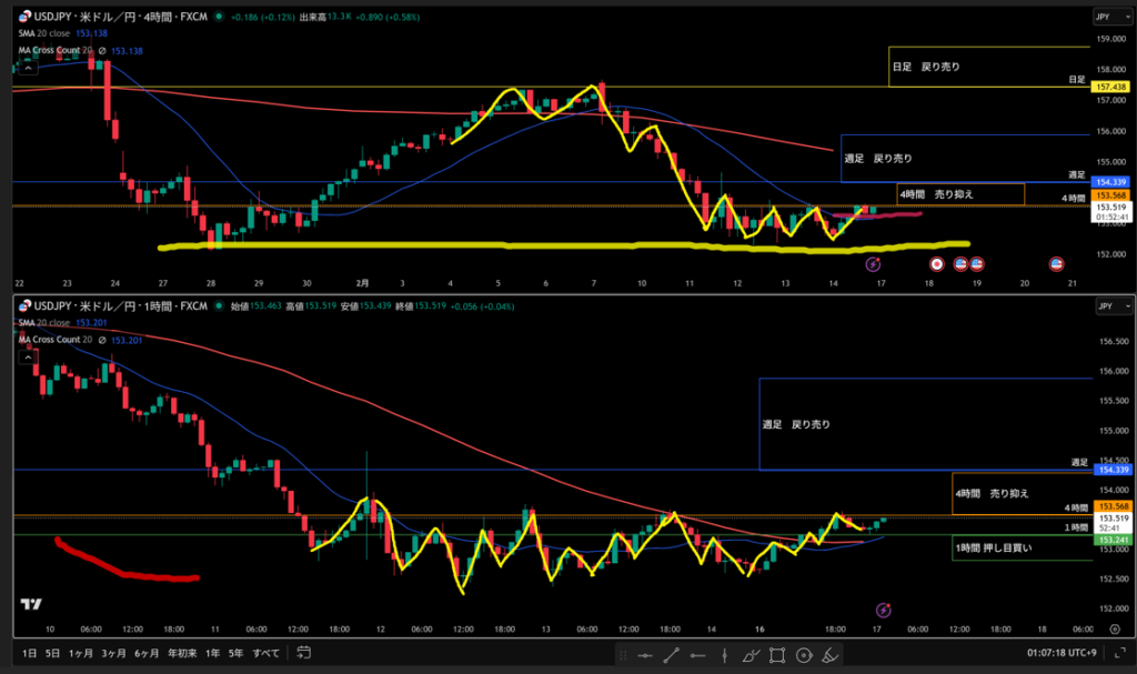 4時間の赤の移動平均線も1時間のロウソク足の下にいる。
