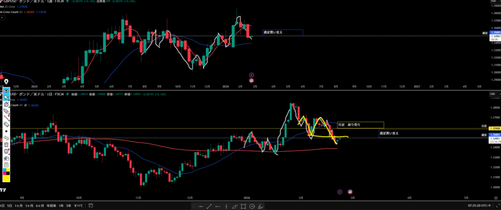 週足の移動平均線と日足の移動平均線に挟まれている感じ。