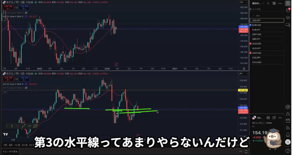 黄色水平線の下に日足買い支え勢力がいる。