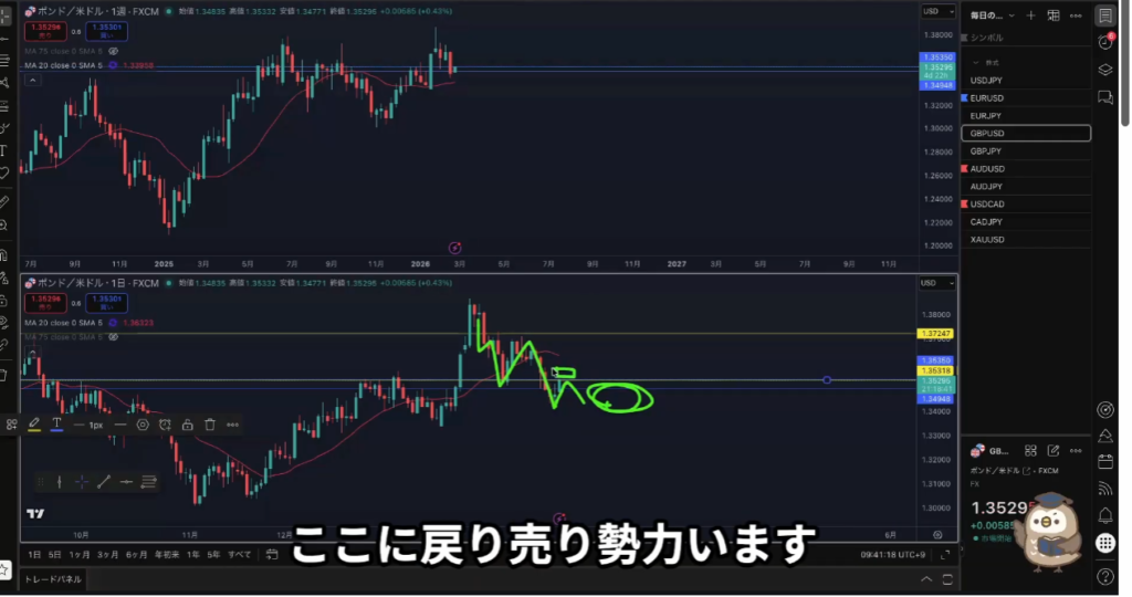 黄色水平線の上に日足の戻り売り勢力がいる。