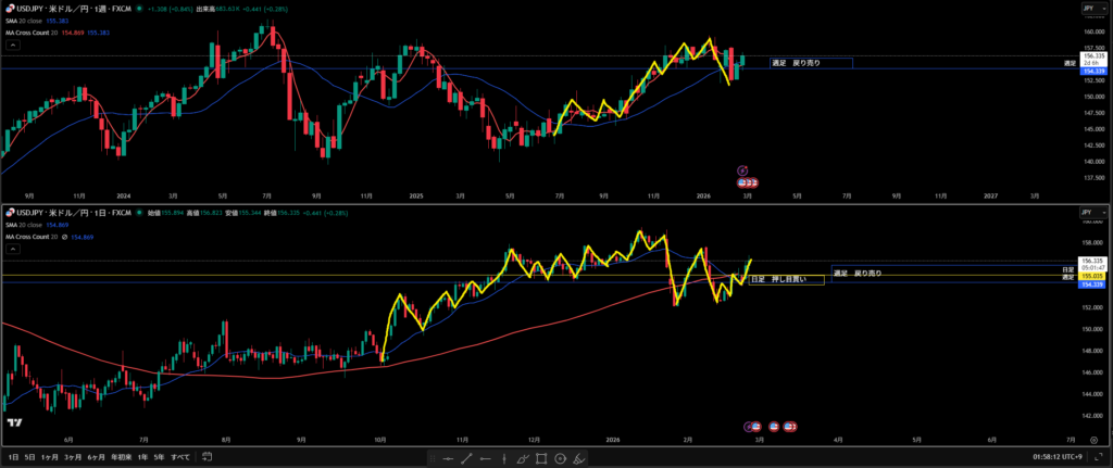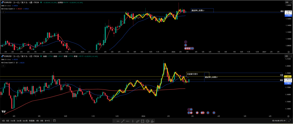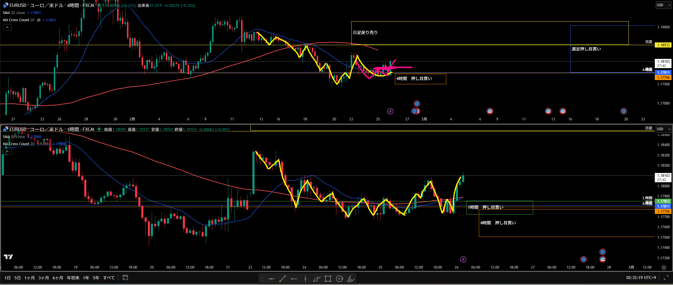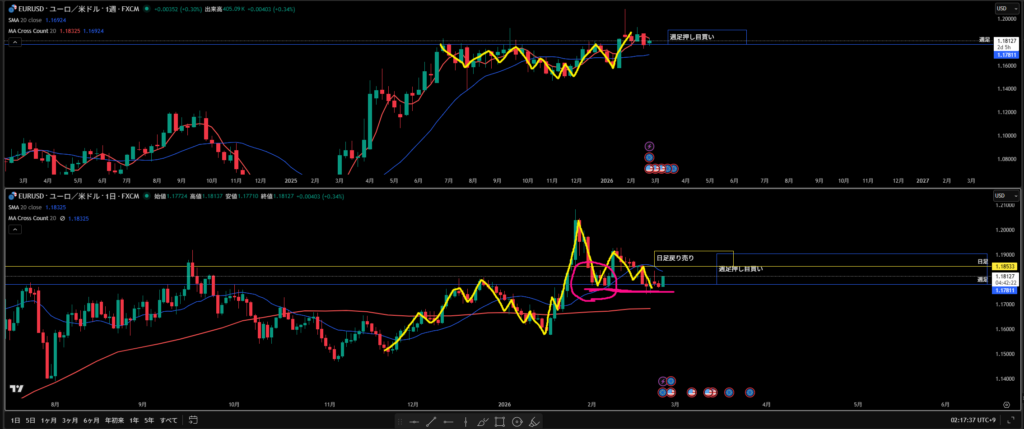 黄色水平線の上に日足の戻り売り勢力がいる。