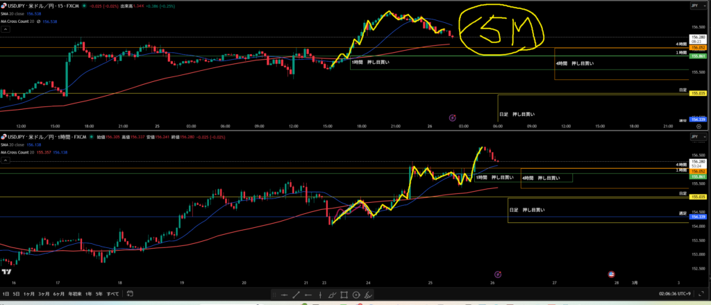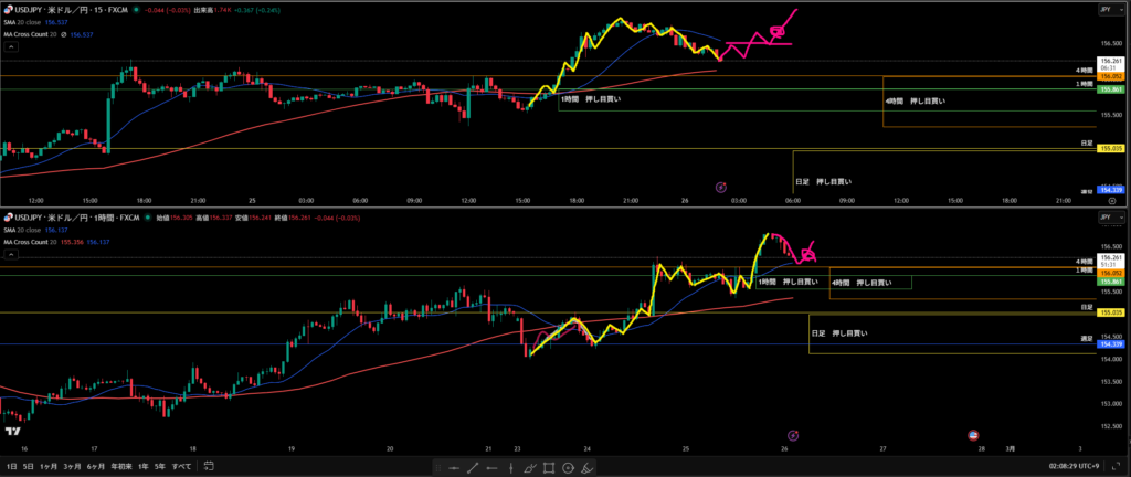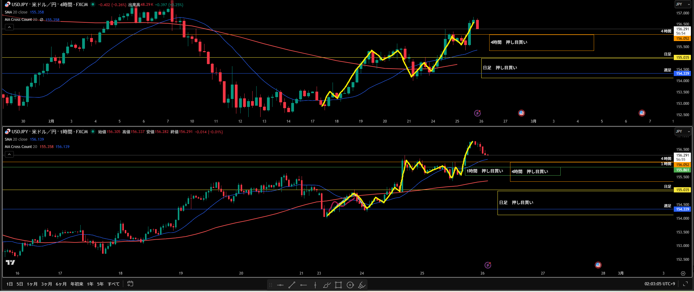 黄色水平線の上に日足の押し目買い勢力がいる。