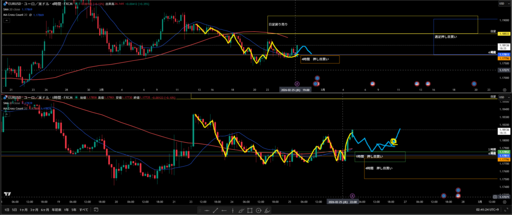 ちょうど環境認識中に週足の押し目買い水平線にあたってきている。