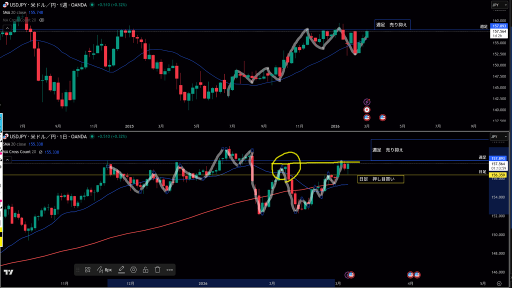 黄色水平線の上に日足の戻り売り勢力がいる。