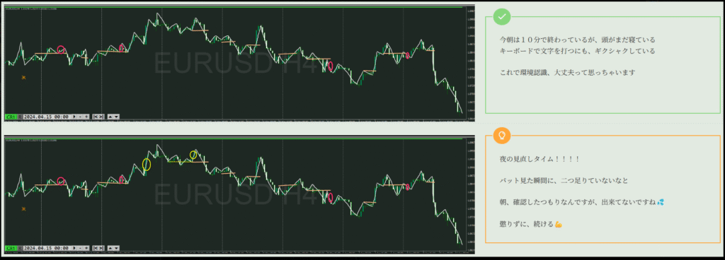 - トレード日誌とは自己成長日誌です。今日トレードに関すること、自分に関することへの気づき、アハ体験を何でも記録していってください