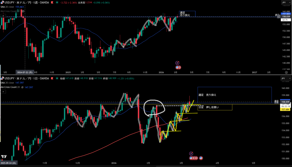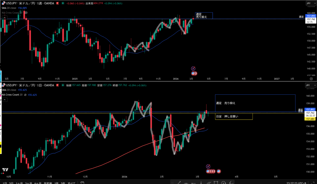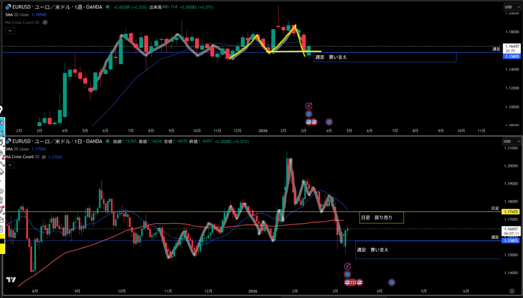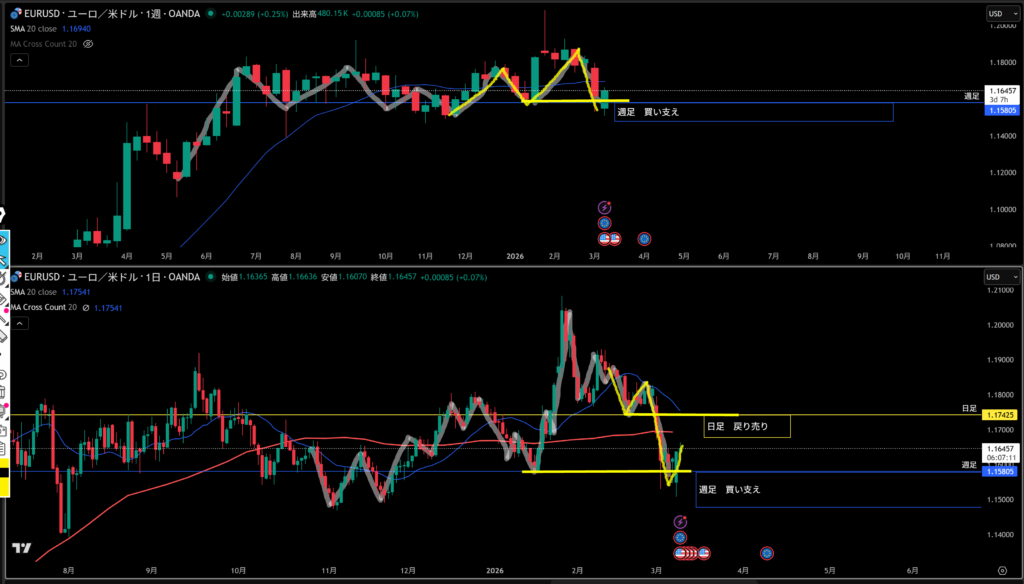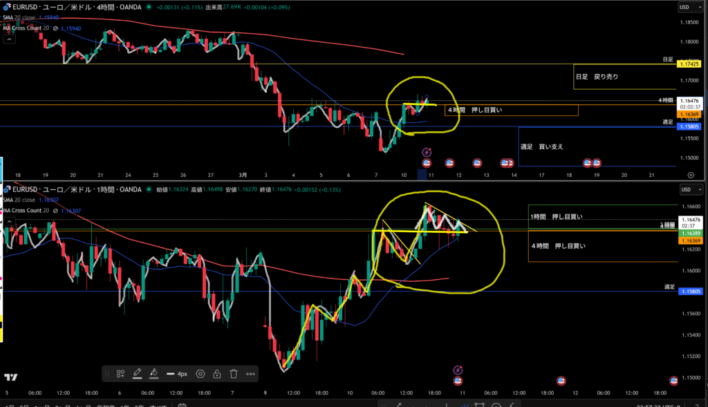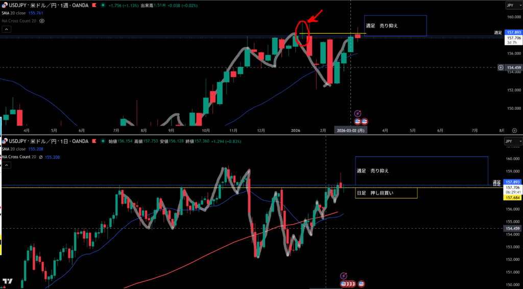 黄色水平線の上に日足の戻り売り勢力がいる。