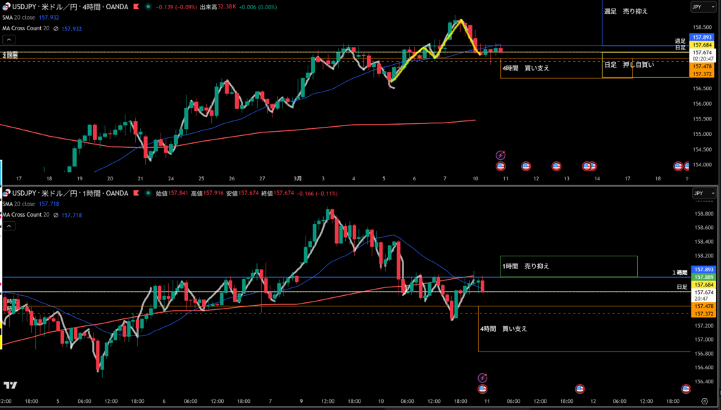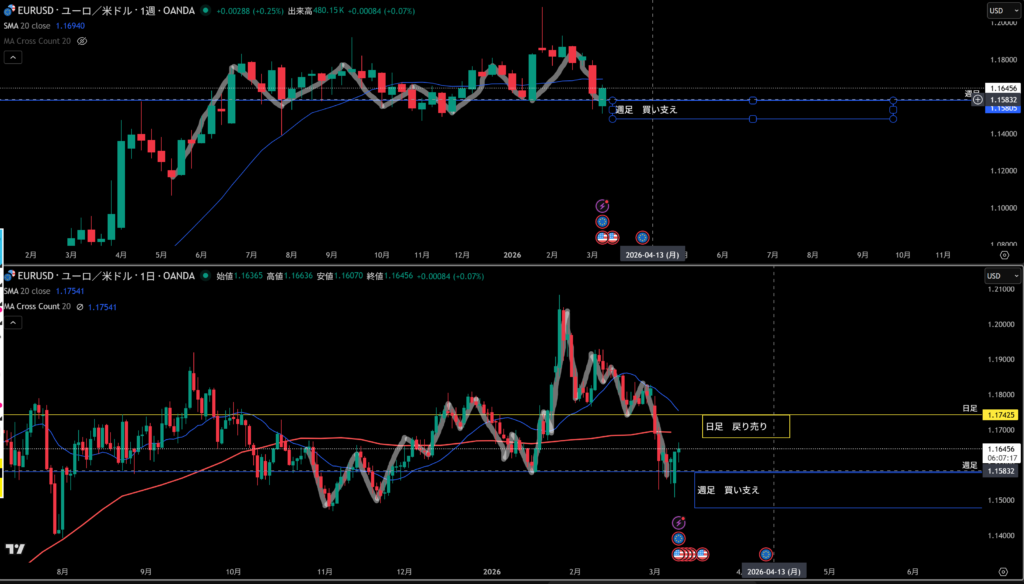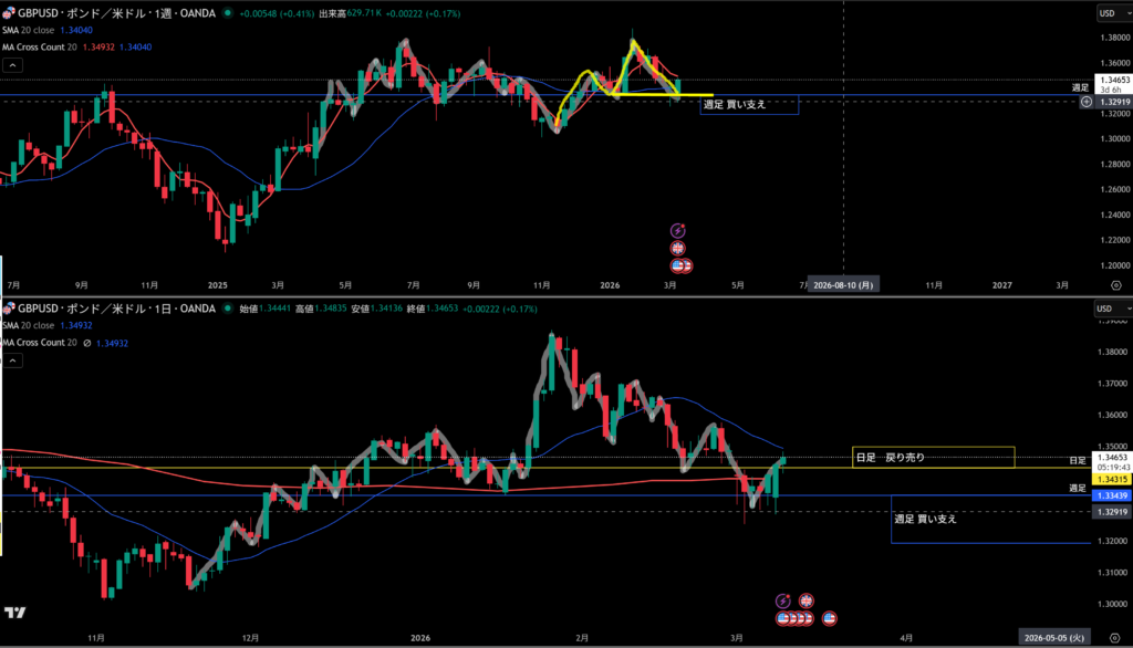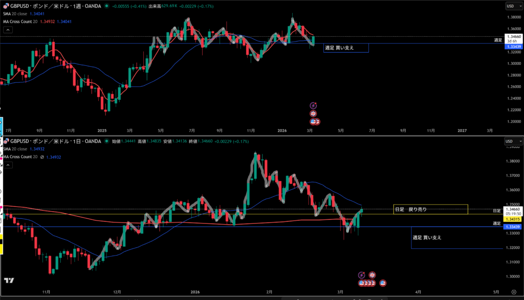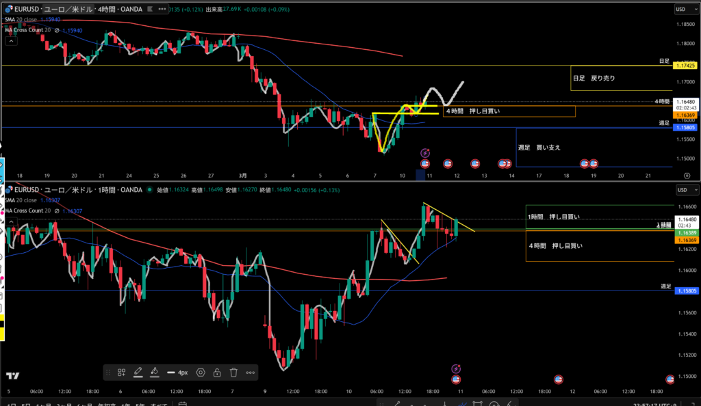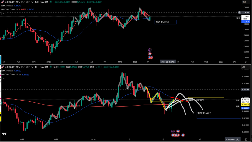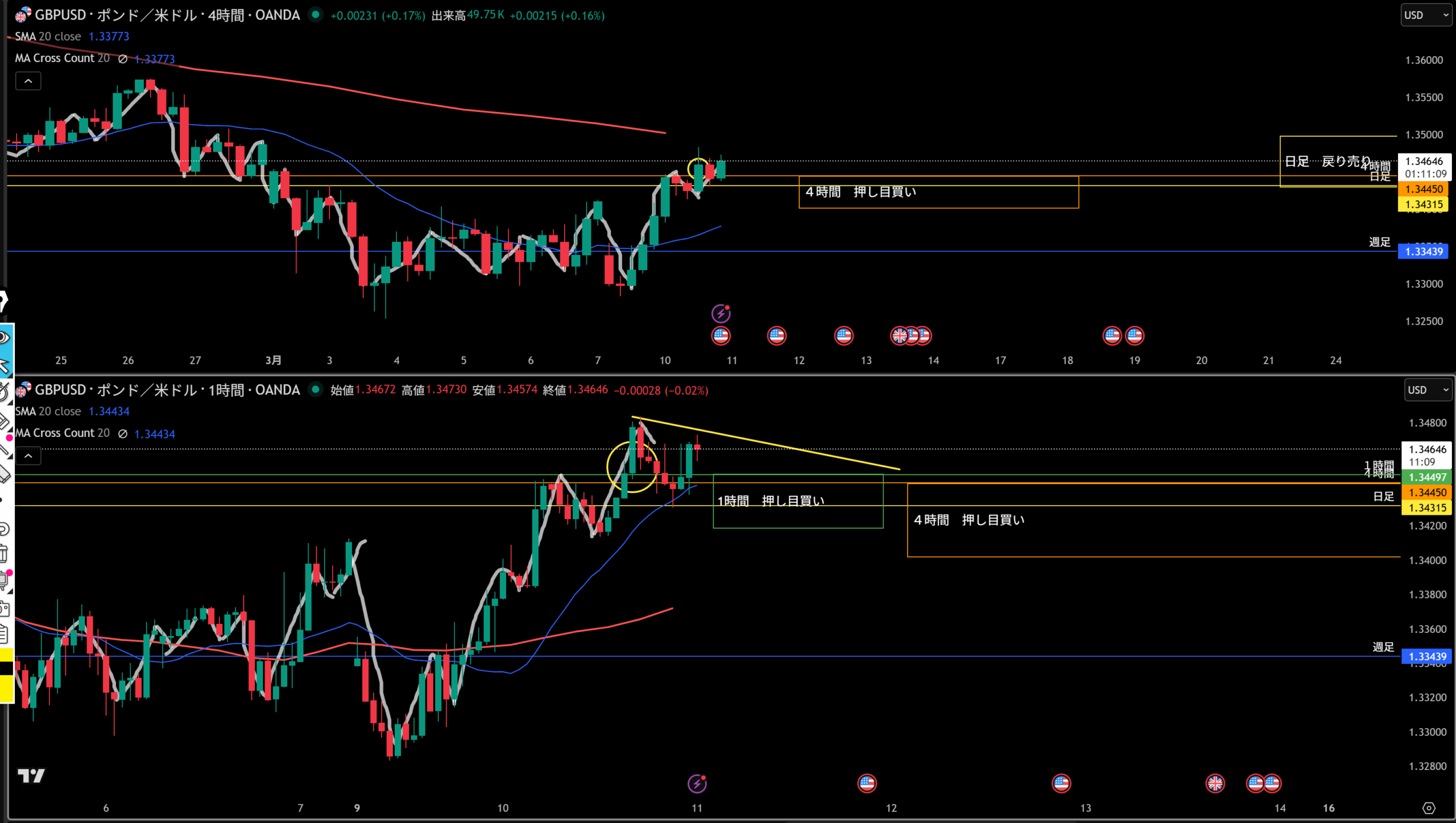 黄色水平線の上に日足の戻り売り勢力がいる。