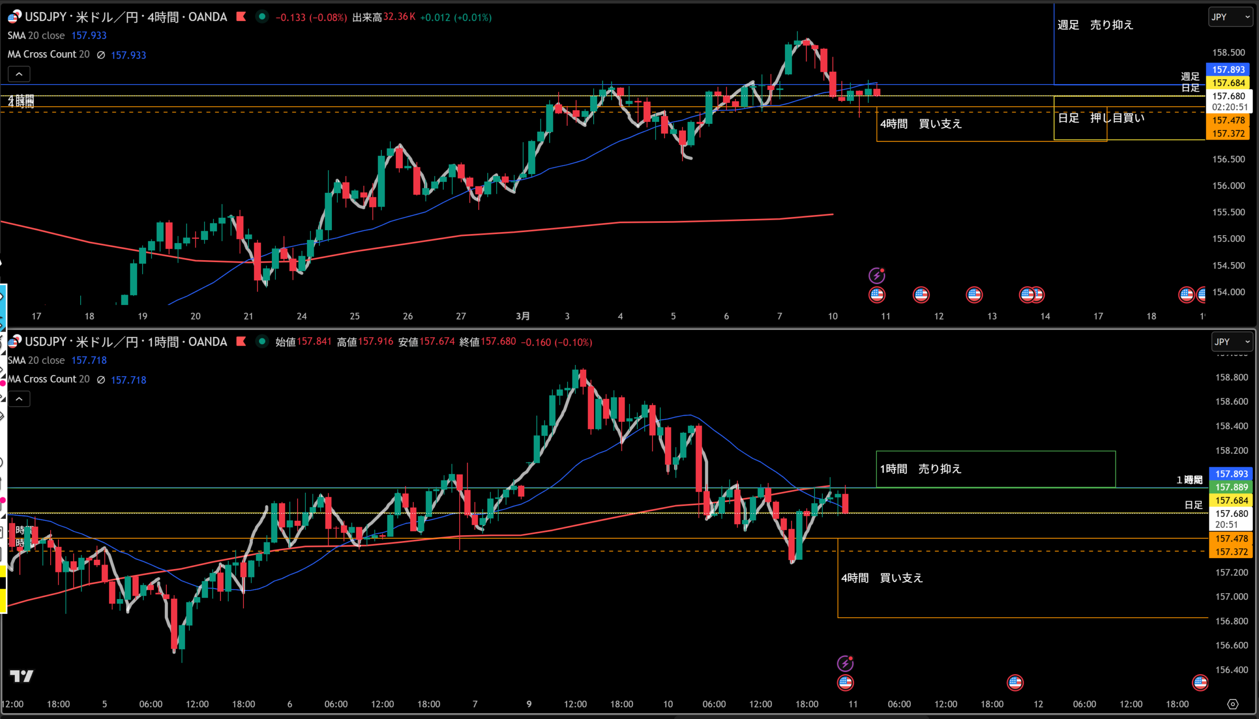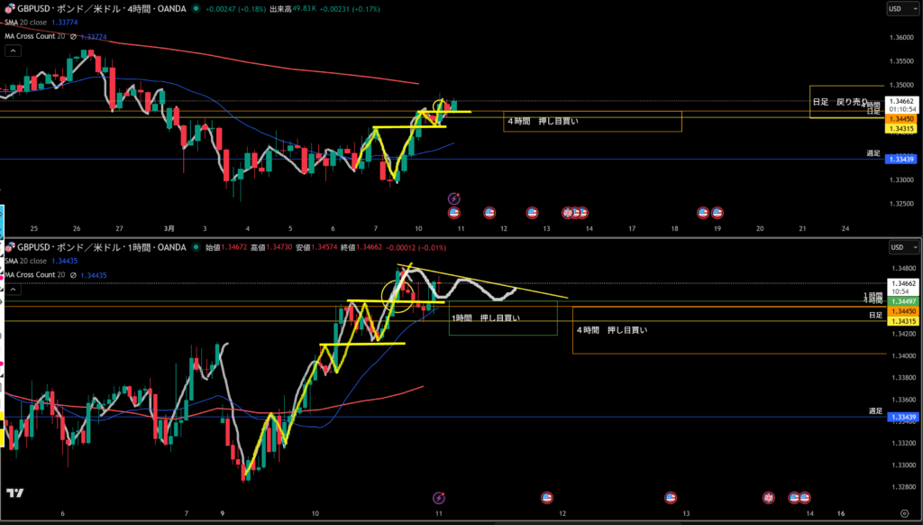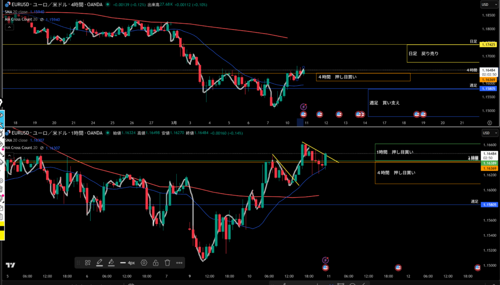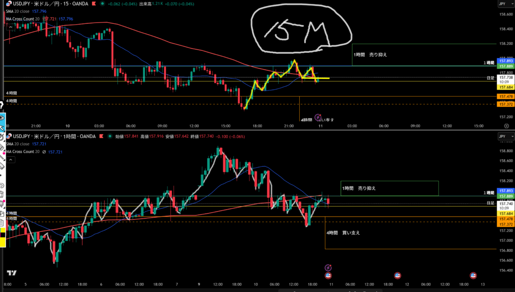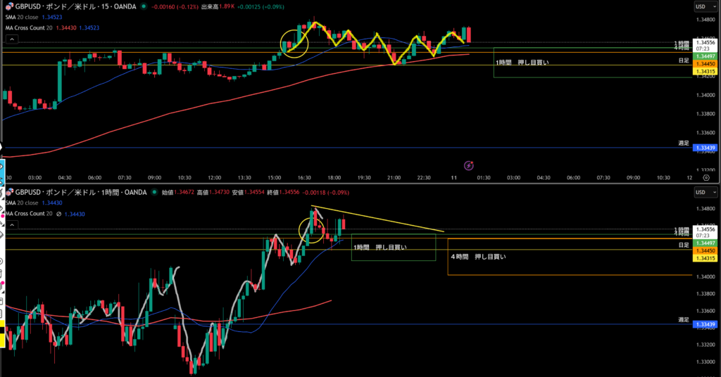 このまま移動平均線よりロウソク足が下に行けば、1時間の売り抑えとして機能しやすい。