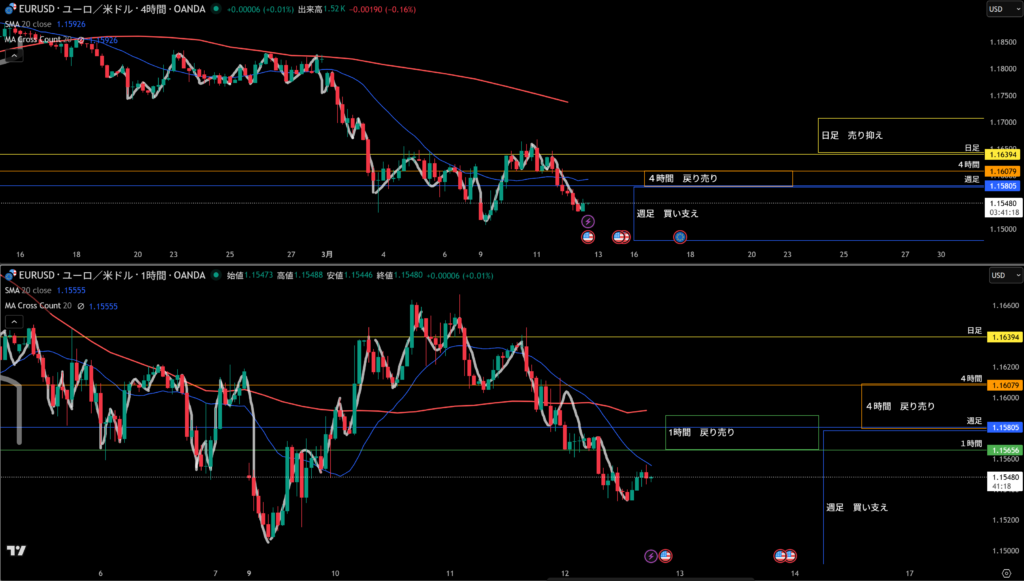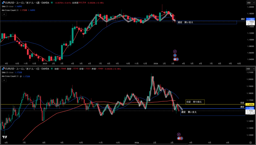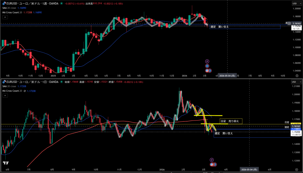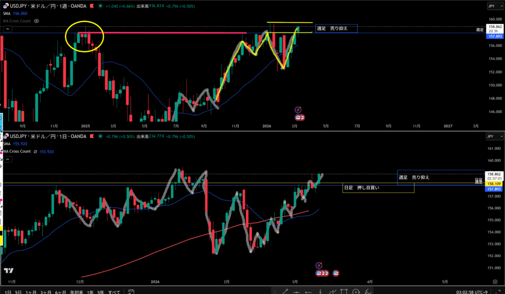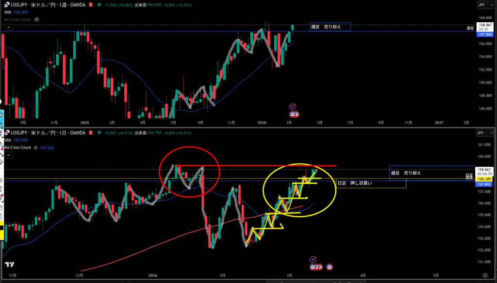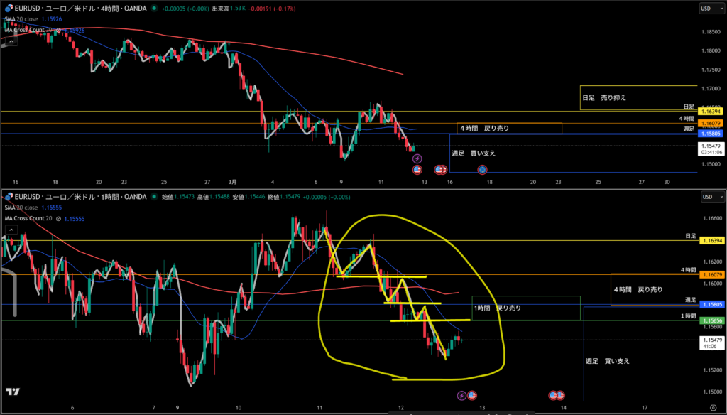 黄色水平線の上に日足の戻り売り勢力がいる。