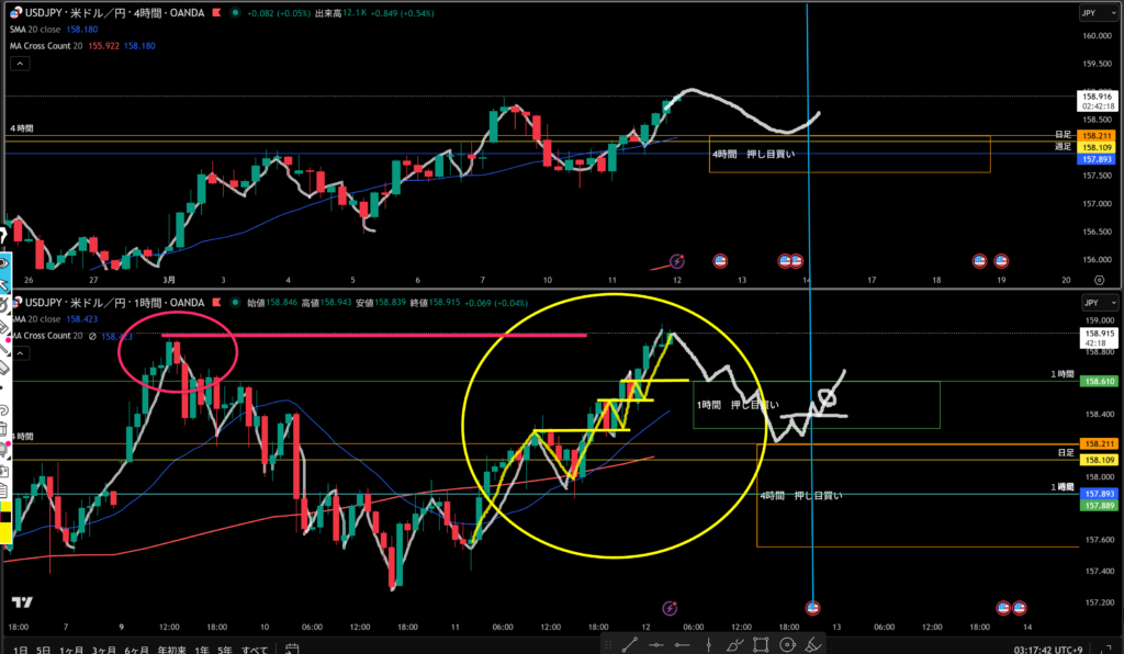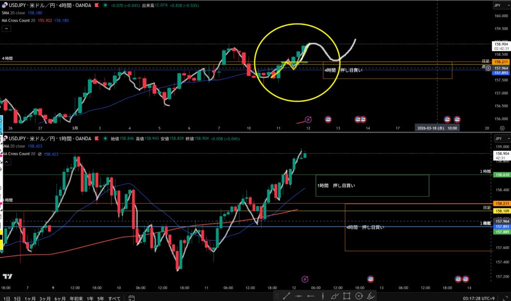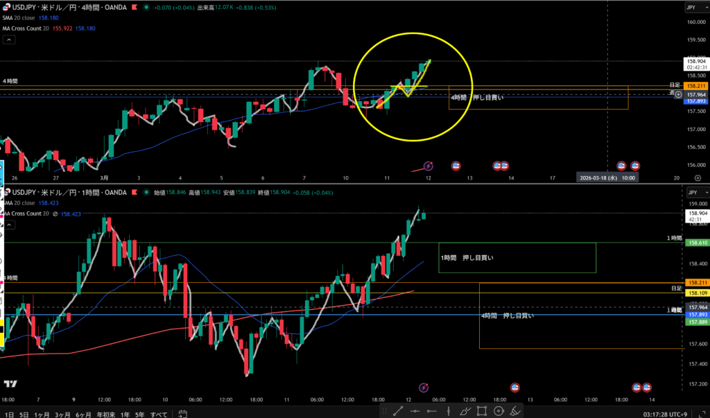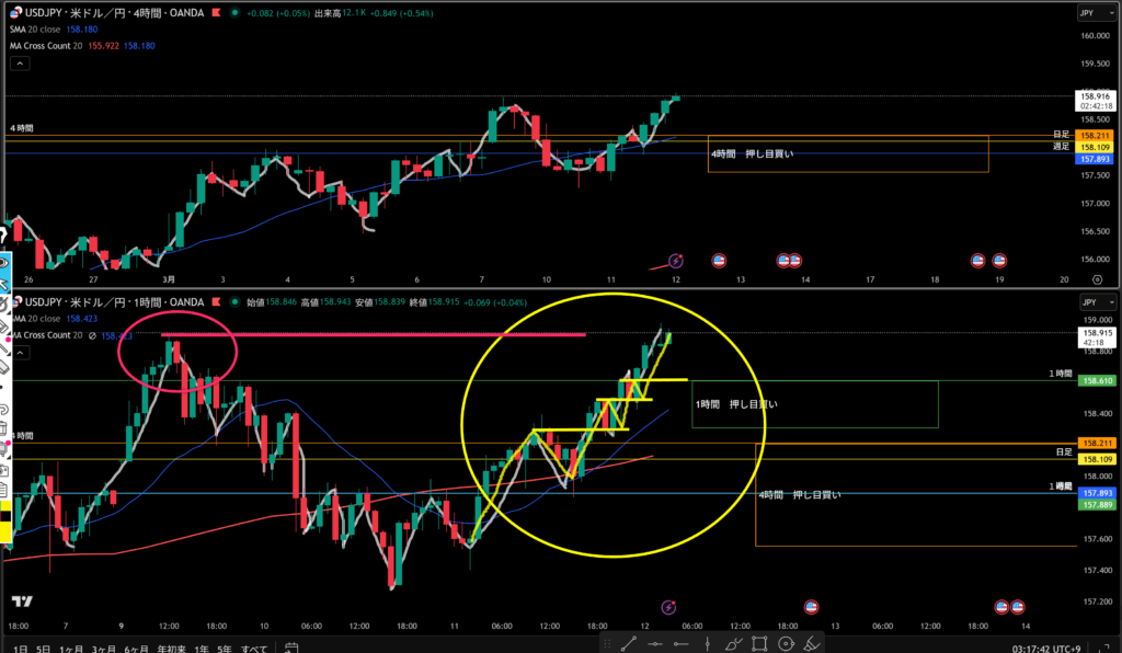 オレンジ色の水平線の上に4時間の押し目買い勢力がいる。