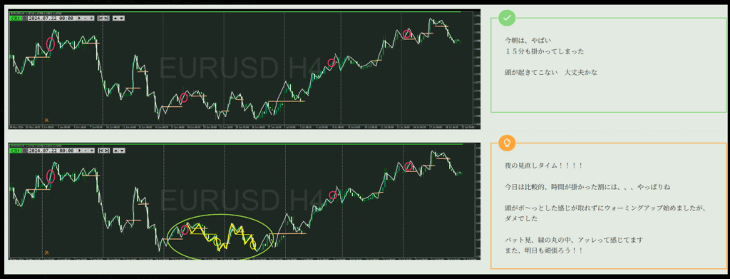 - トレード日誌とは自己成長日誌です。今日トレードに関すること、自分に関することへの気づき、アハ体験を何でも記録していってください