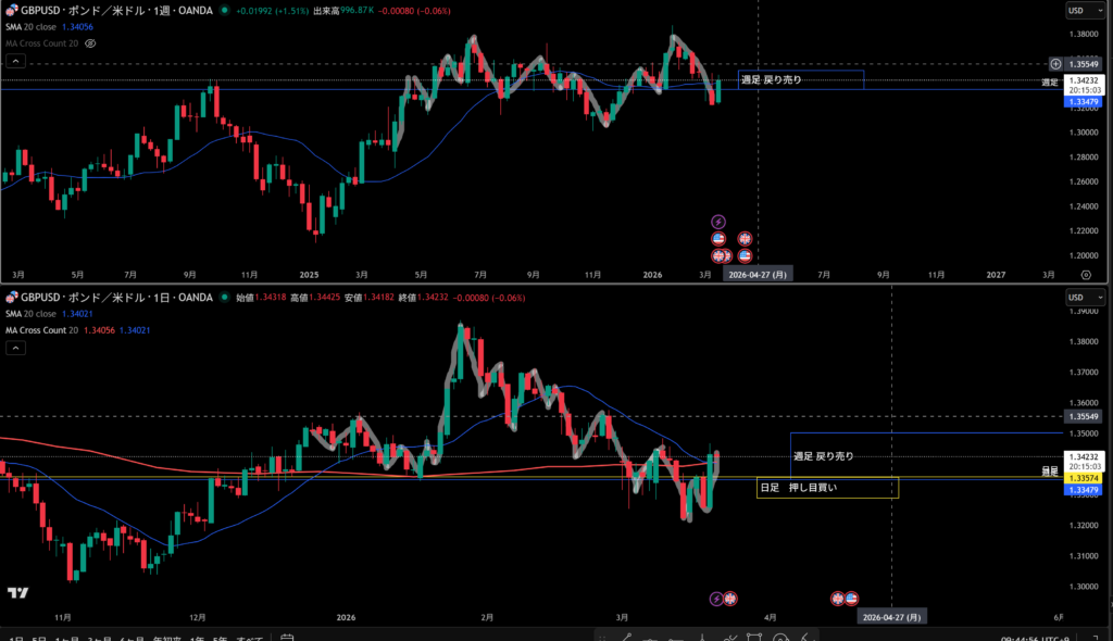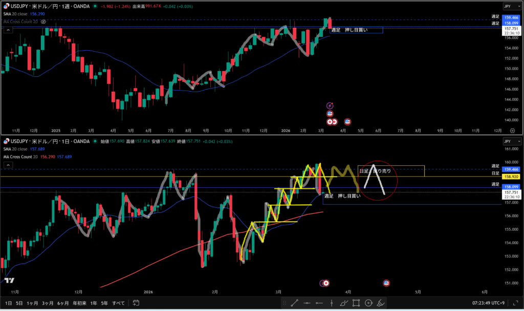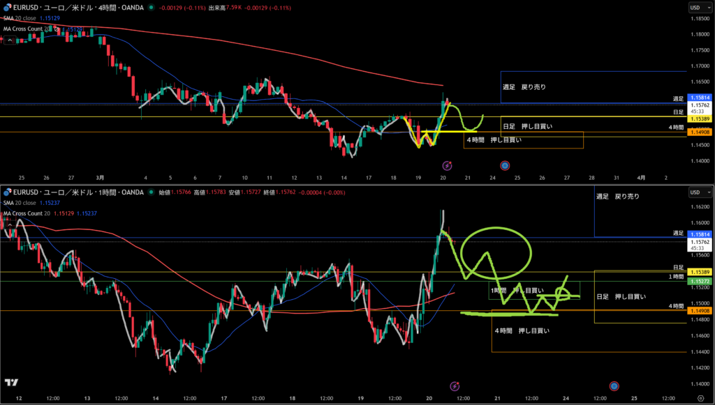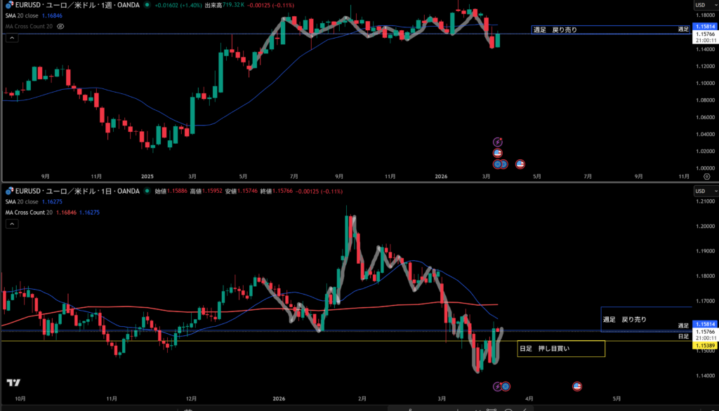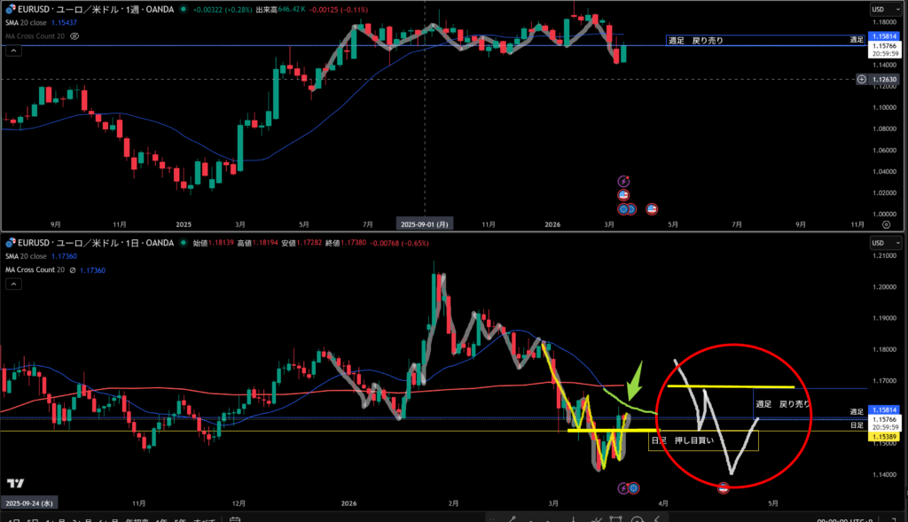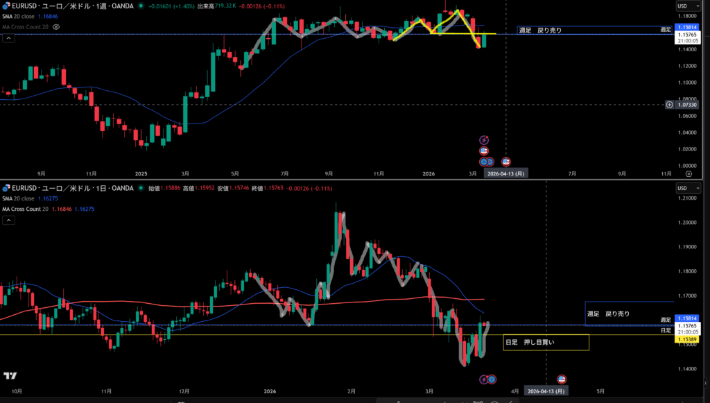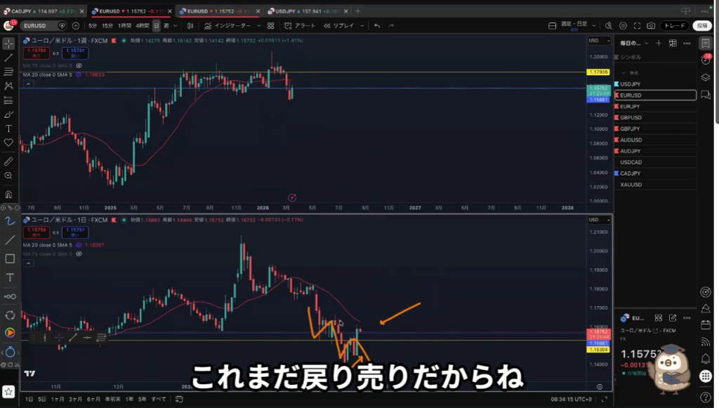 黄色水平線の上に日足の戻り売り勢力がいる。