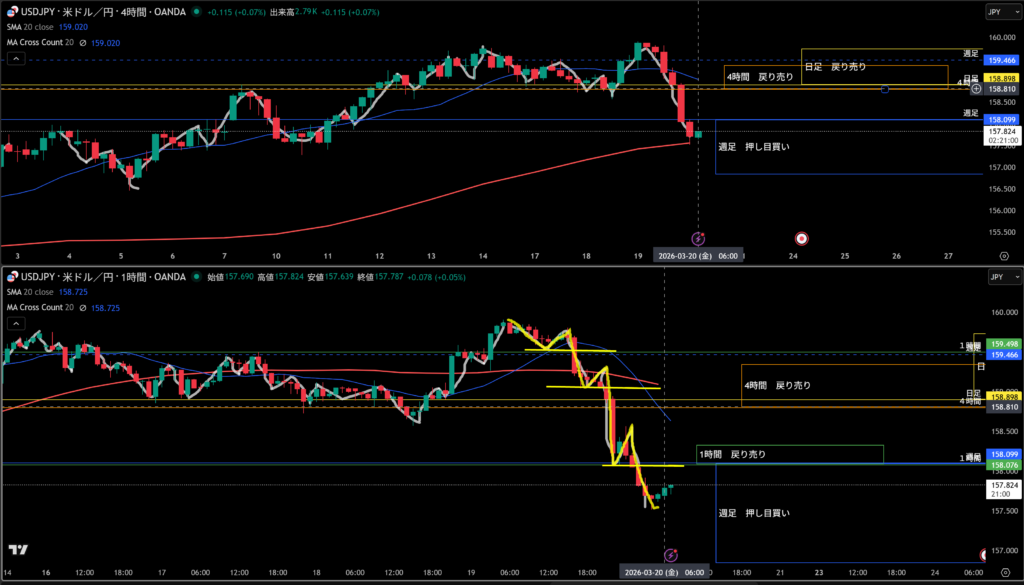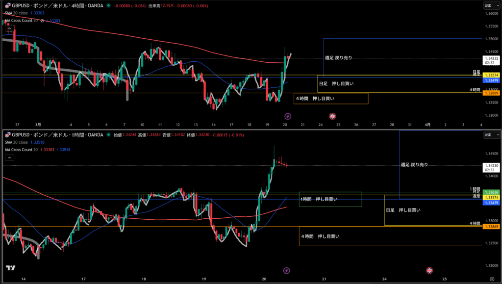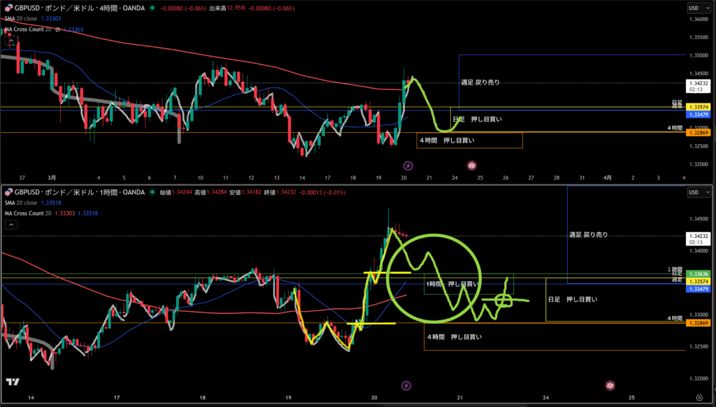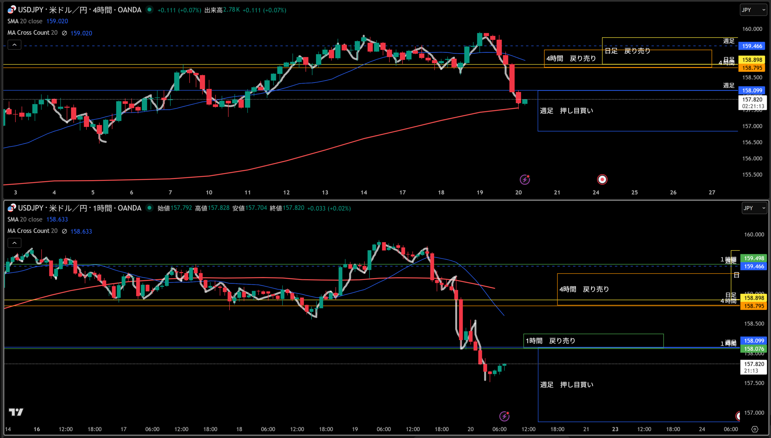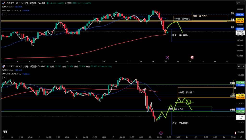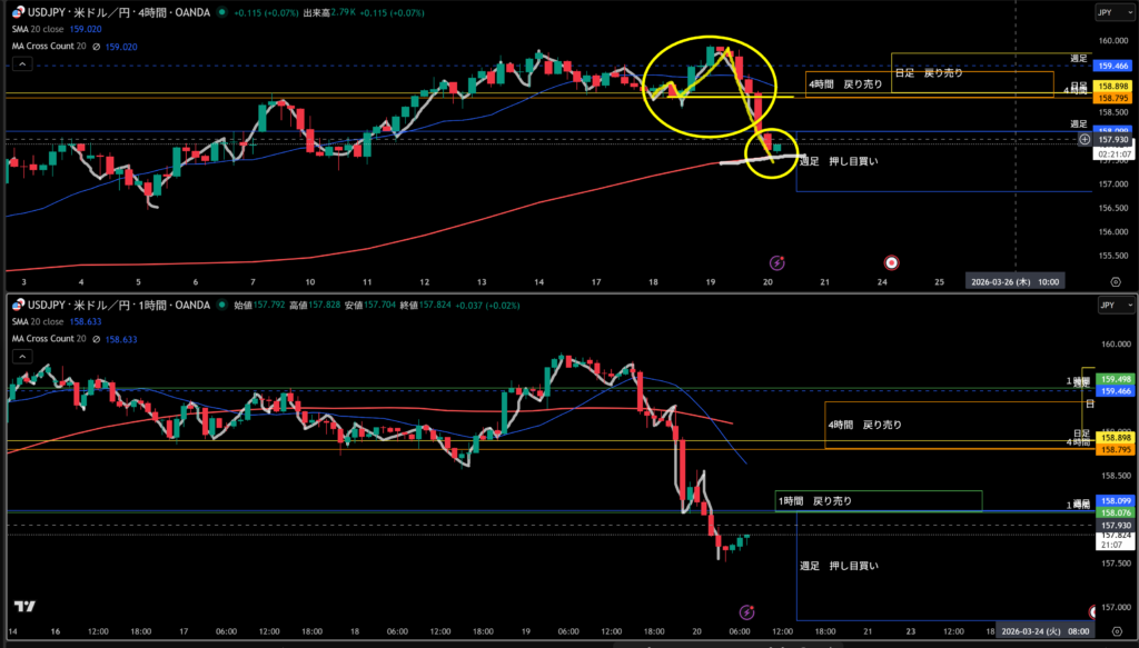 週足は戻り売りで、日足は押し目買いで今そのエリアにいるので4時間の押し目買いエリアにはスッとこなさそう!