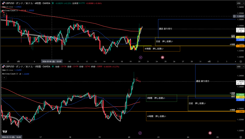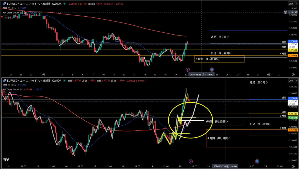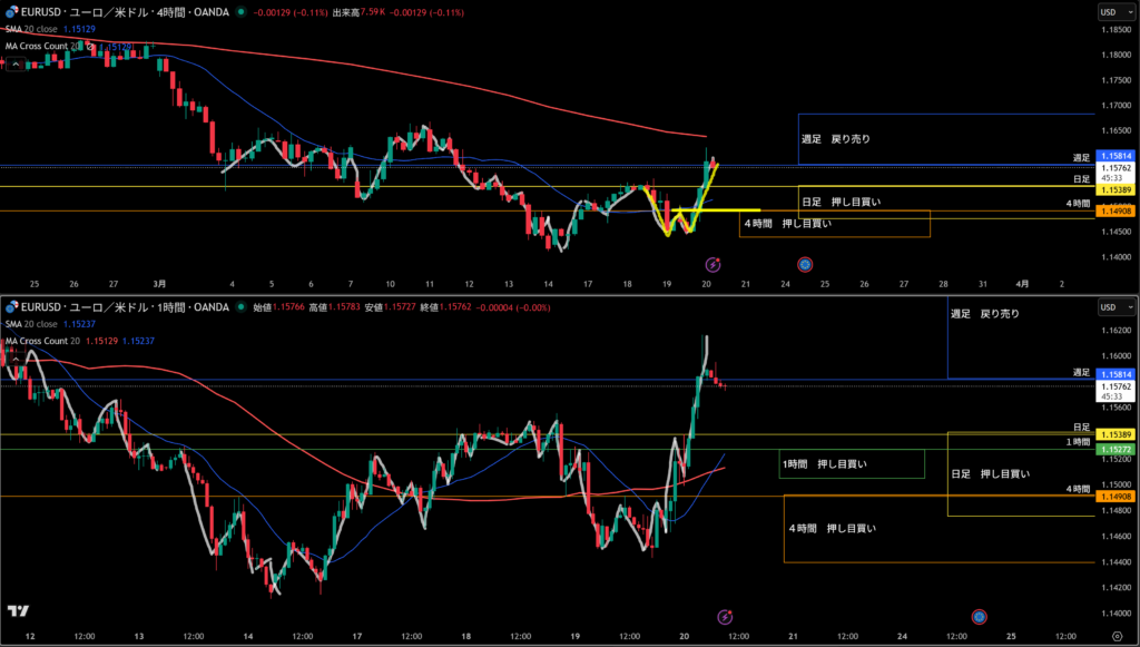 移動平均線は上向き4時間の買い支えとして機能しやすい。