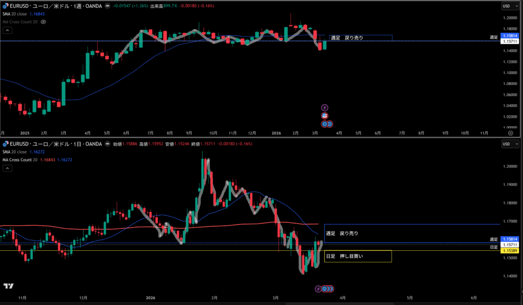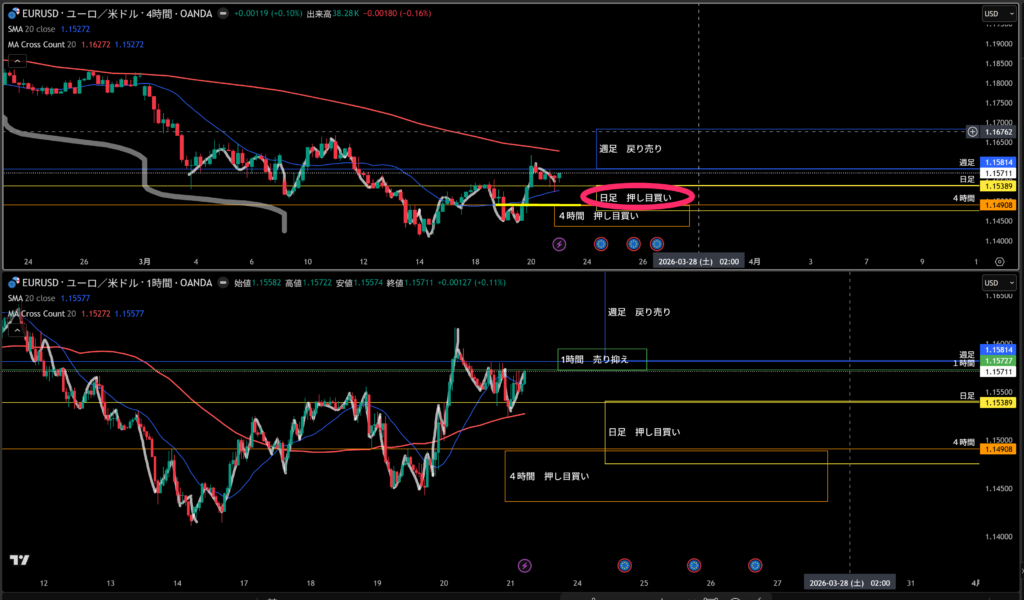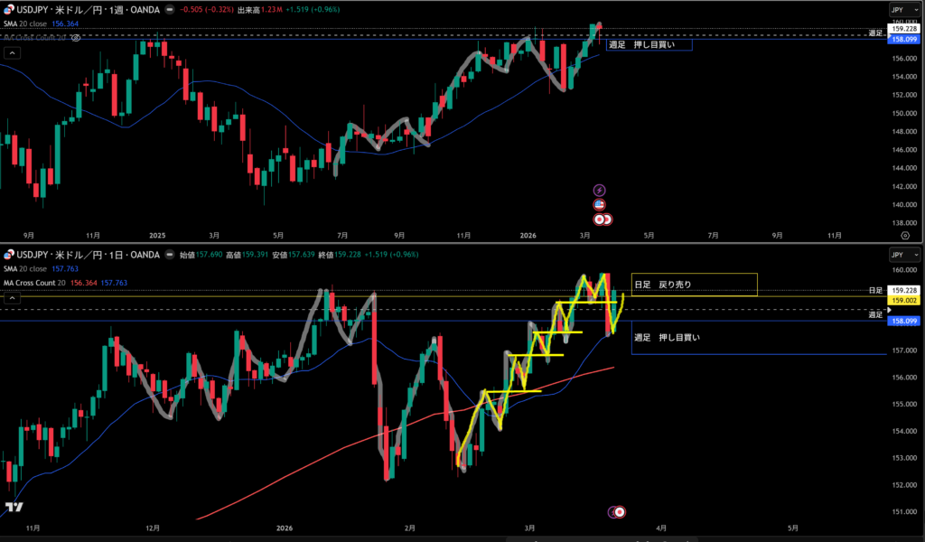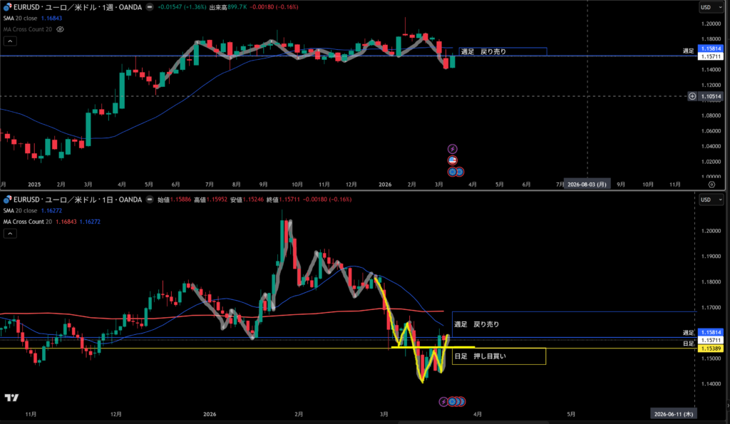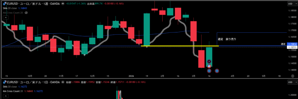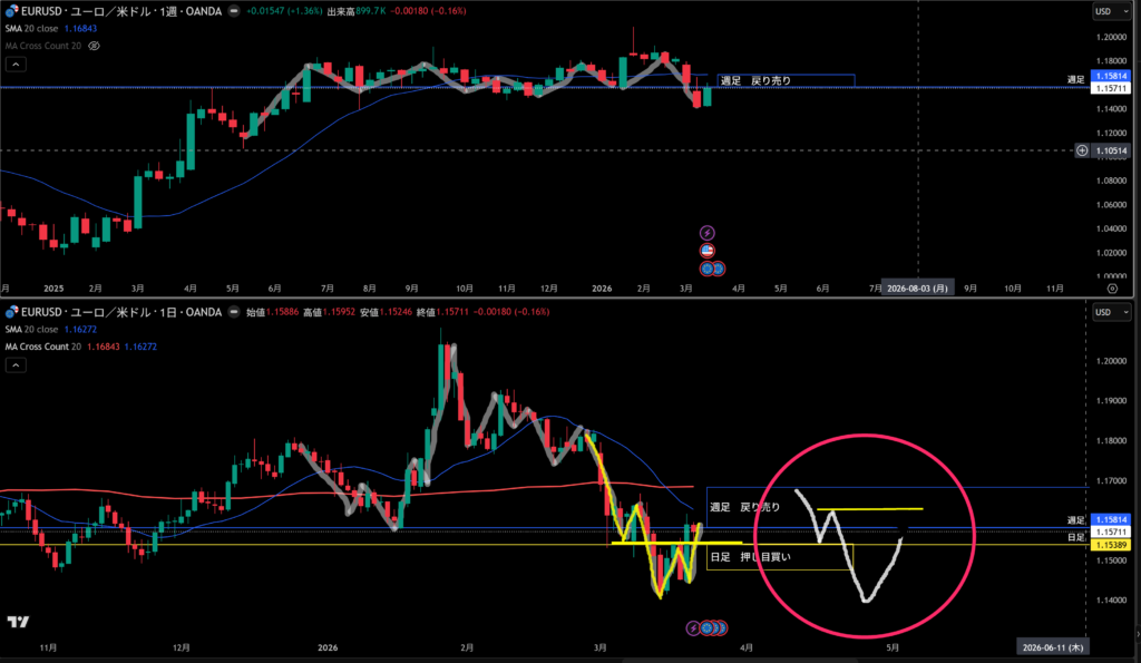 黄色水平線の上に日足の戻り売り勢力がいる。