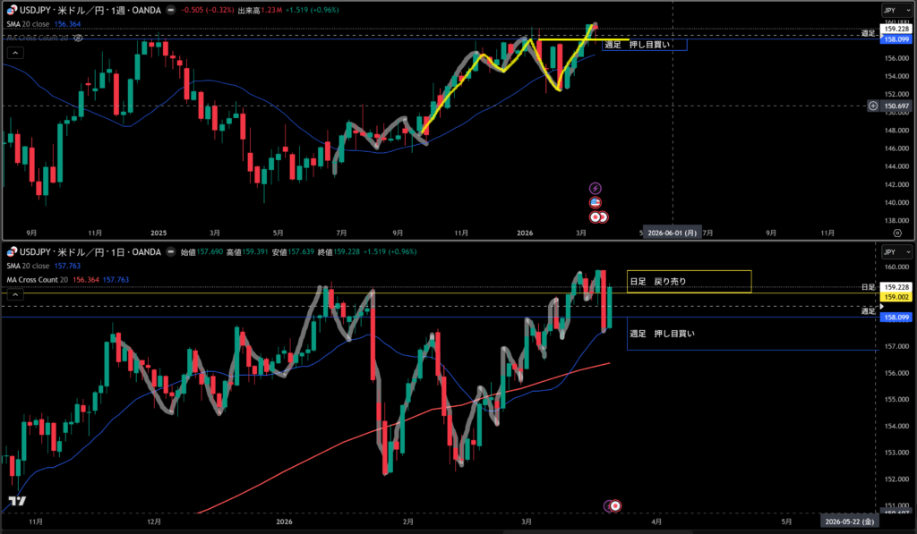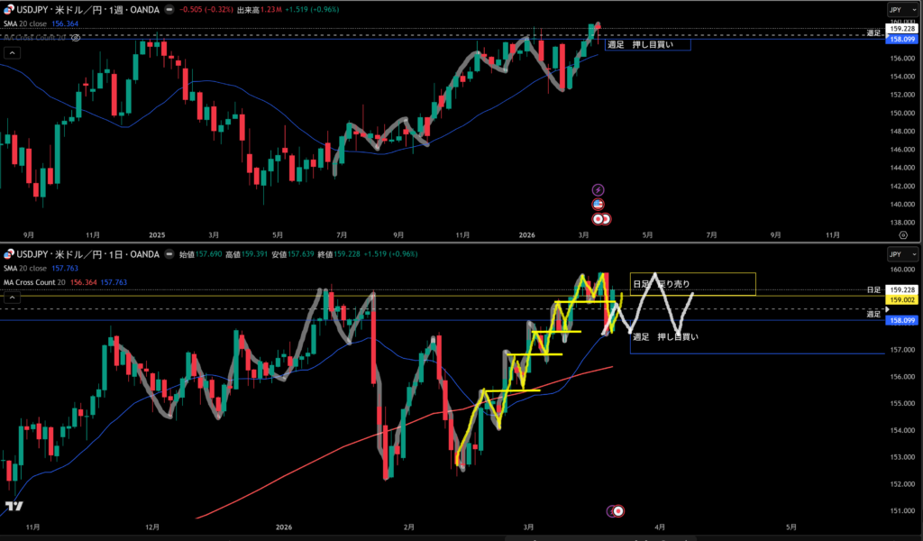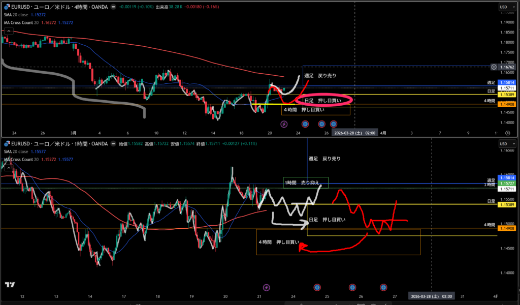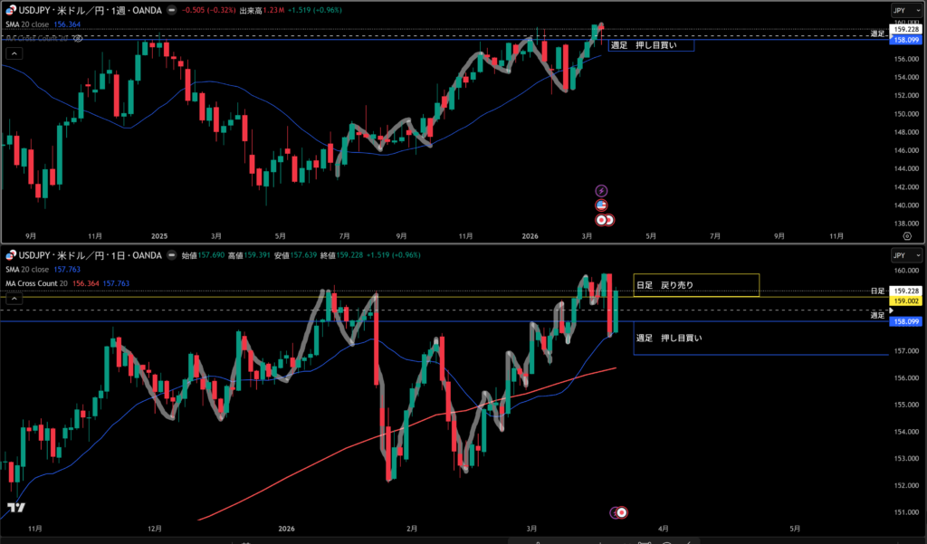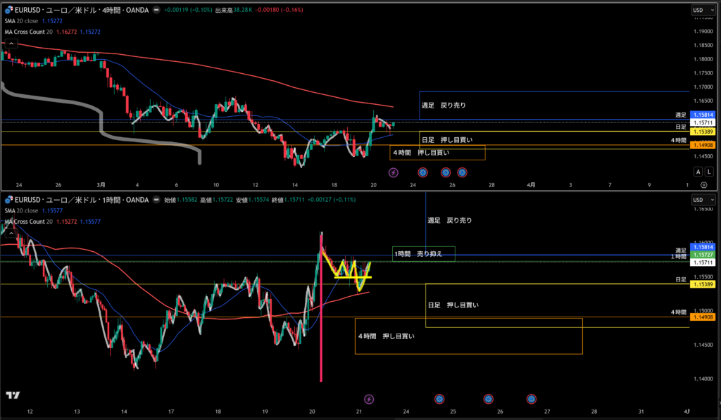黄色水平線の上に日足の戻り売り勢力がいる。