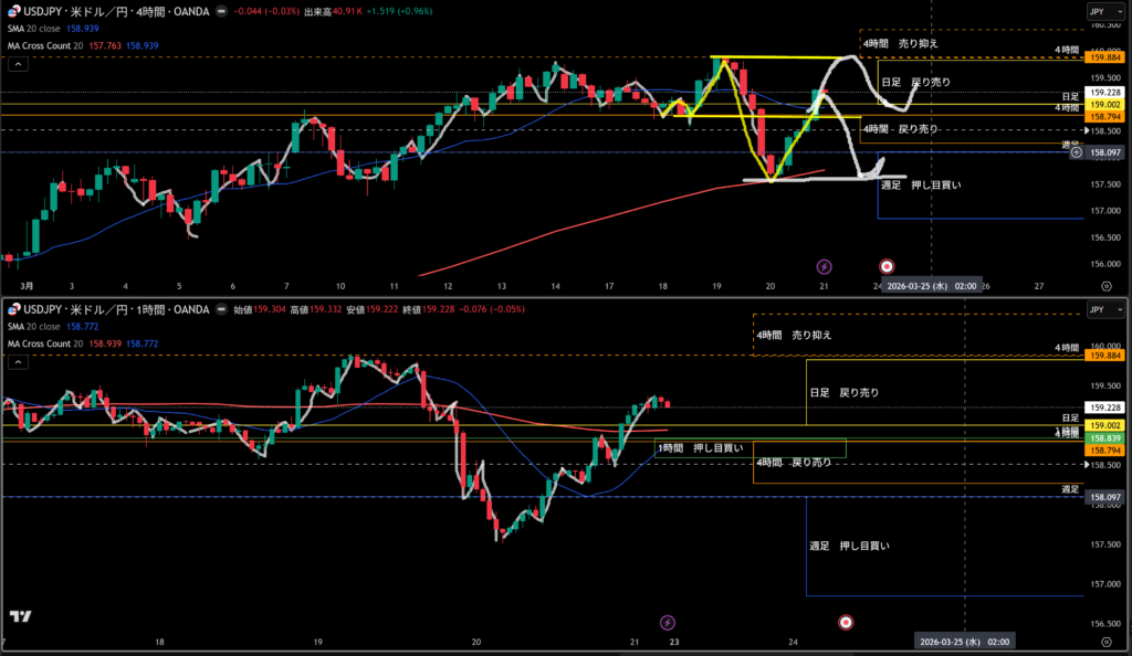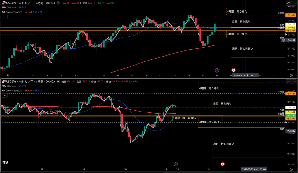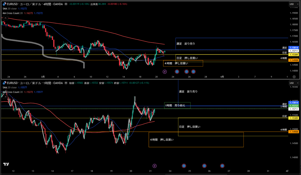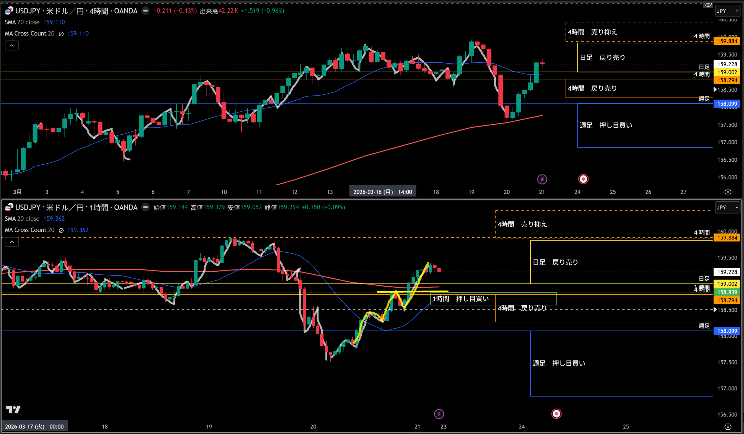 移動平均線は上向き4時間の買い支えとして機能しやすい。