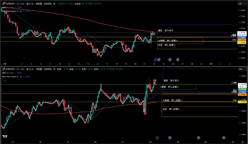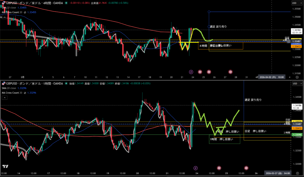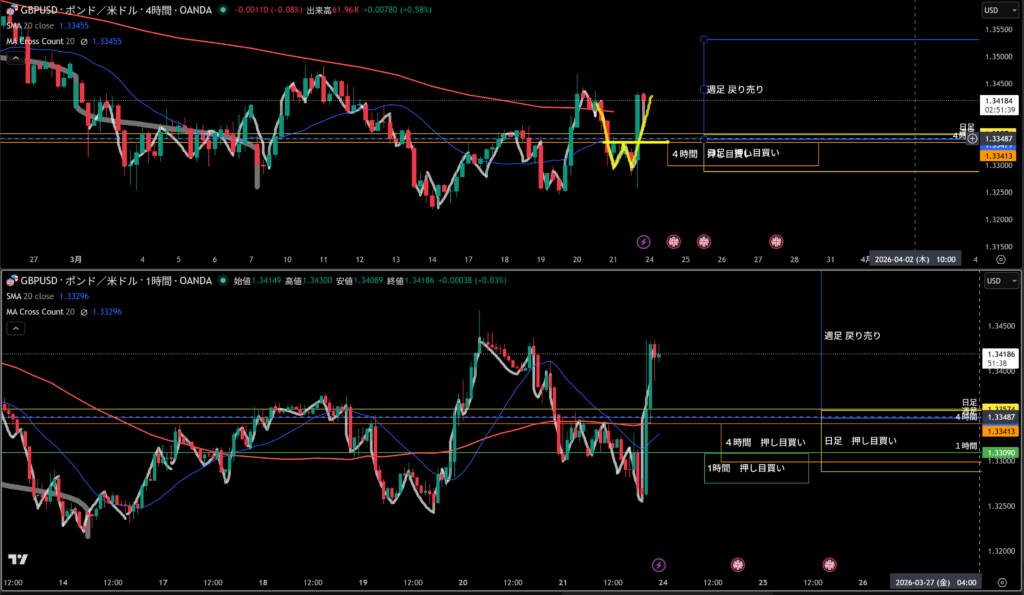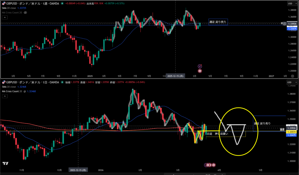 週足戻り売り、日足押し目買いの勢力がいるあたりになる!
