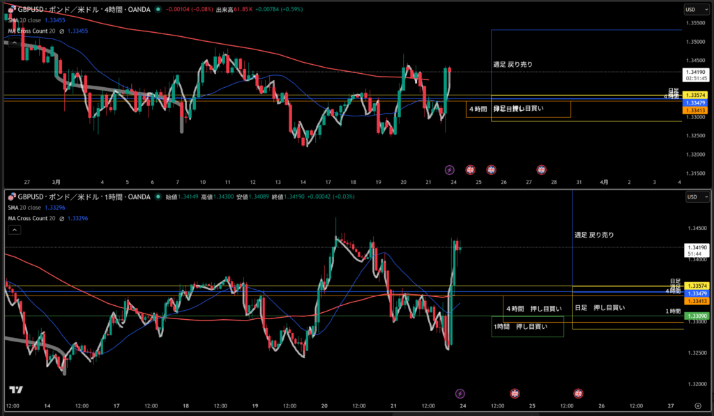 4時間押し目買い勢力エリアと日足押し目買い勢力エリア両方ある!