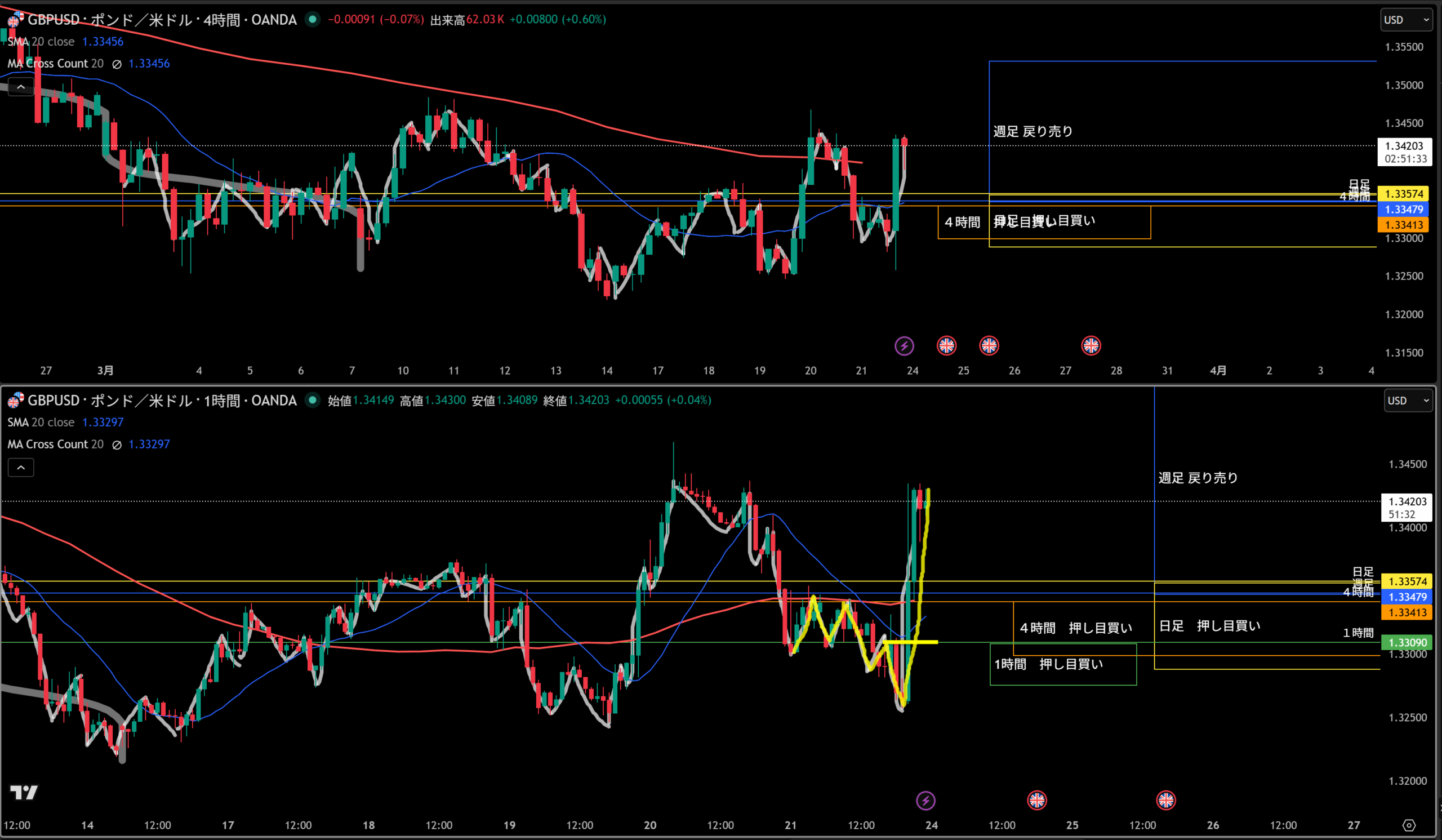 移動平均線は上向き4時間の買い支えとして機能しやすい。
