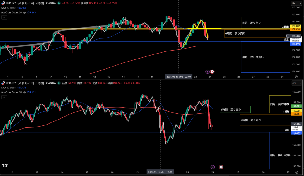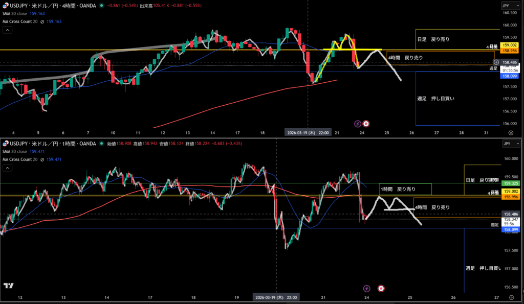 4時間足方向は下。