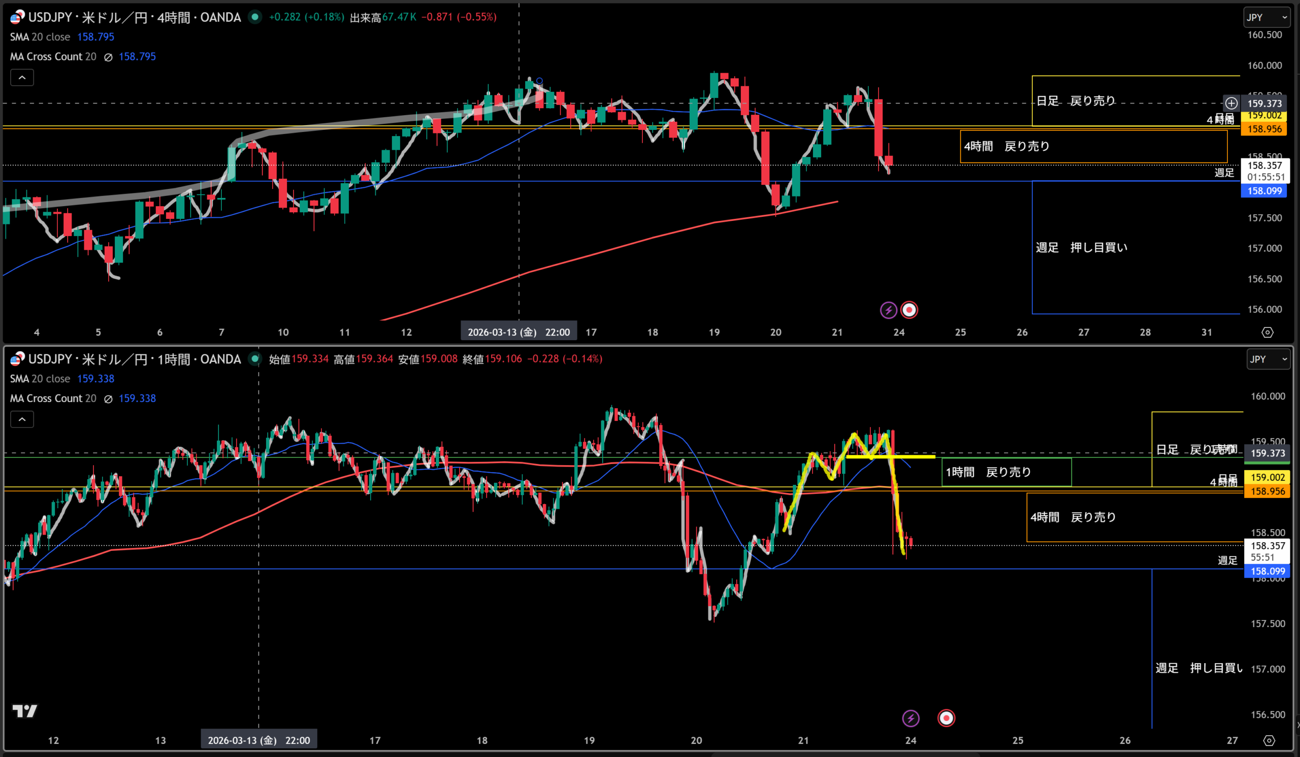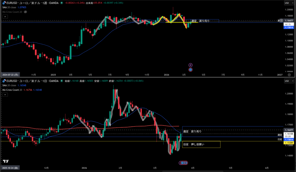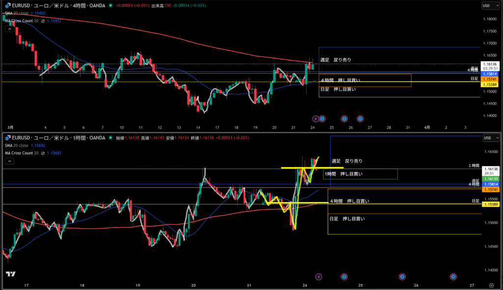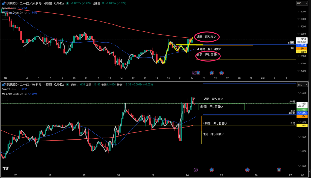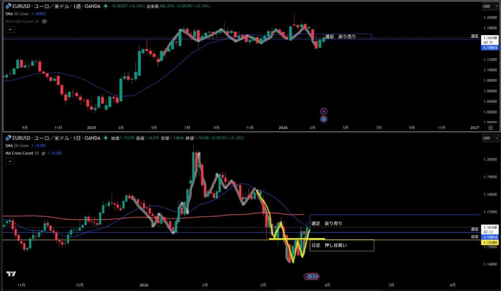黄色水平線の上に日足の戻り売り勢力がいる。