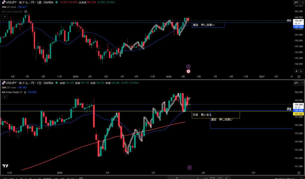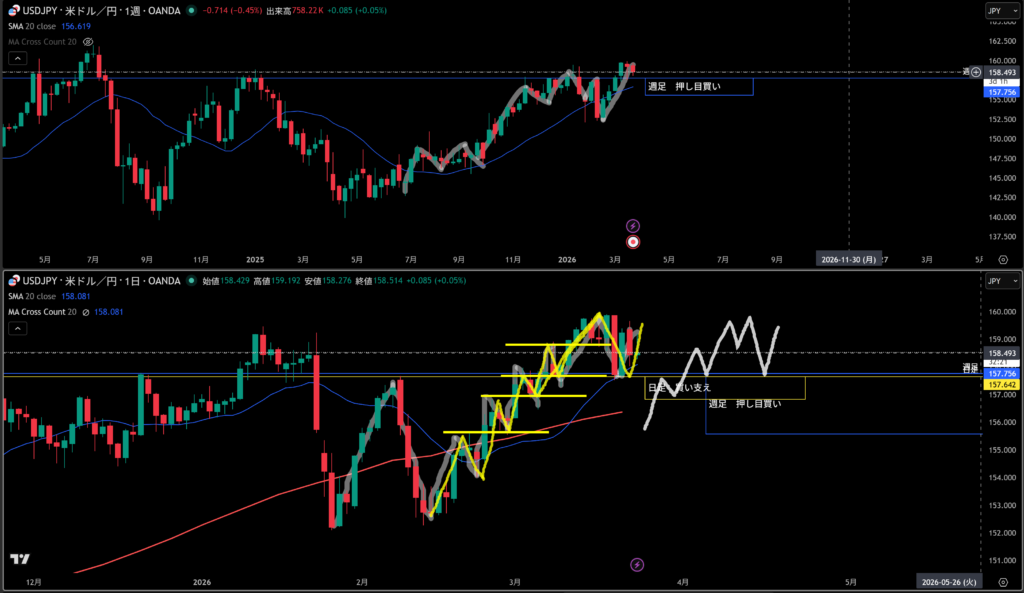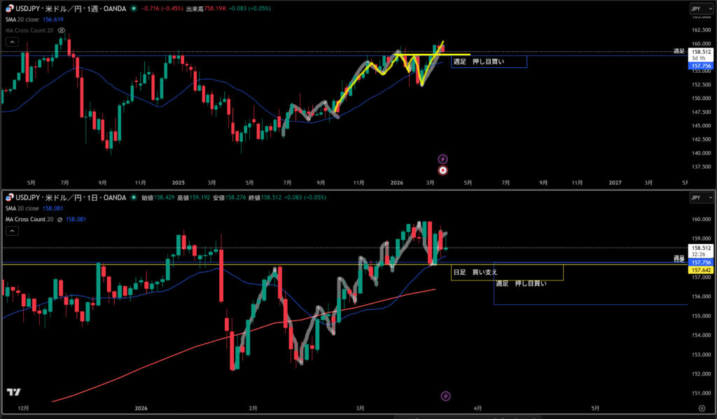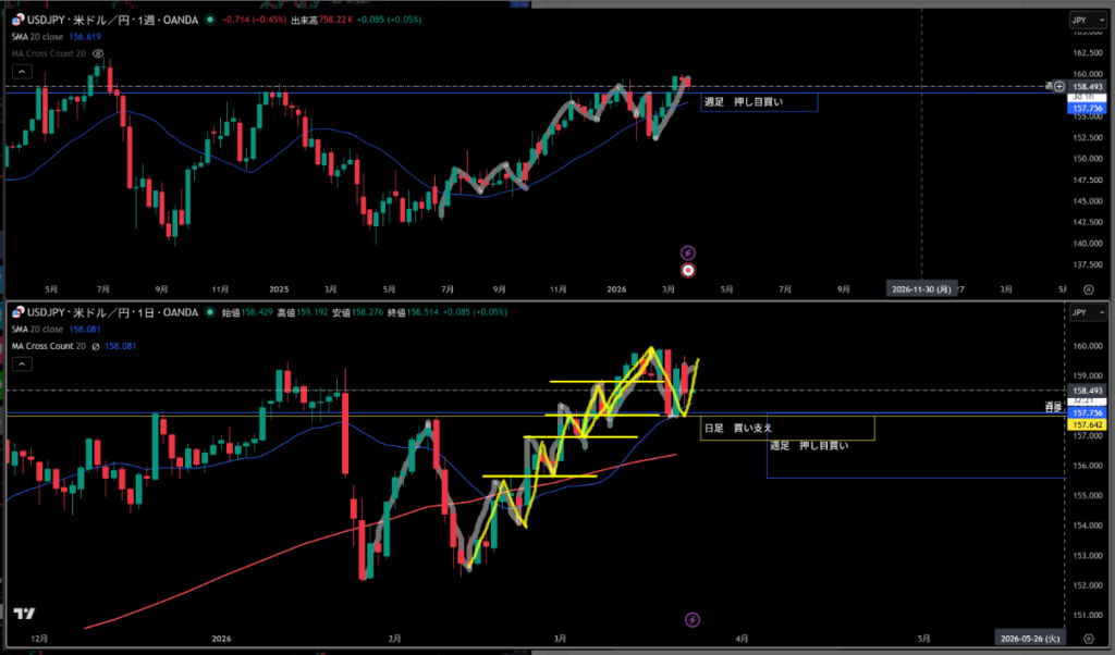 黄色水平線の上に日足の押し目買い勢力がいる。