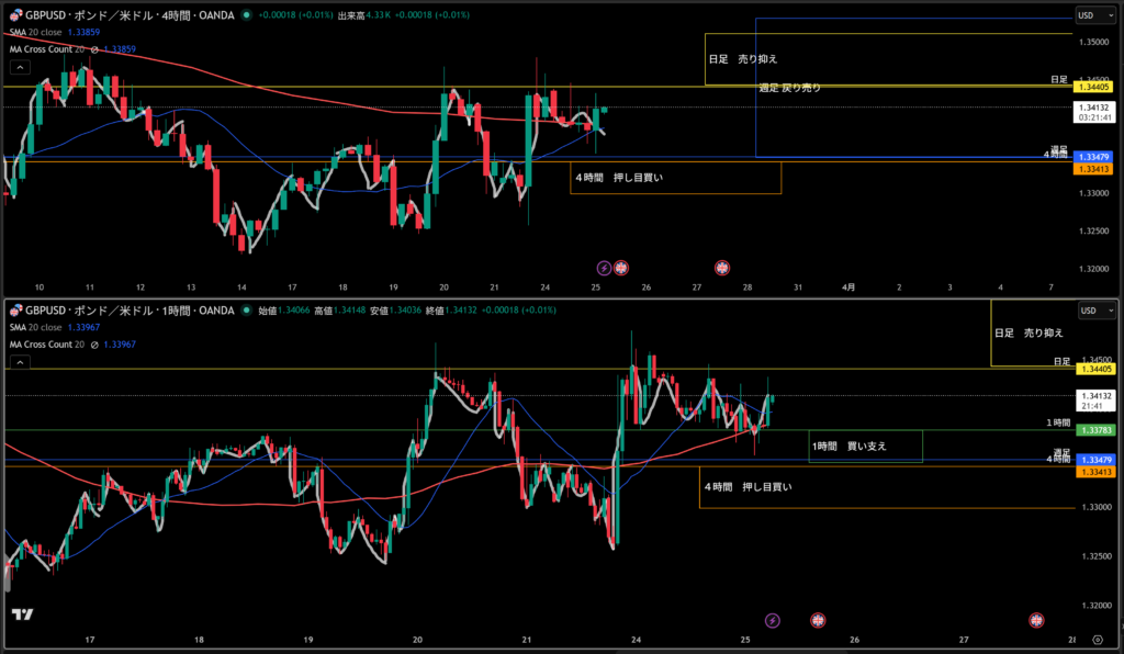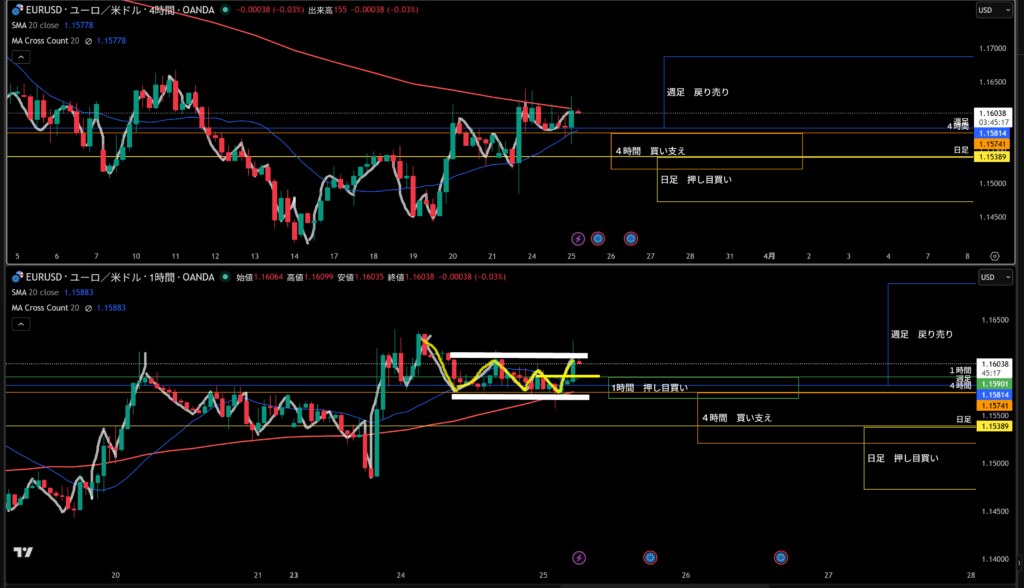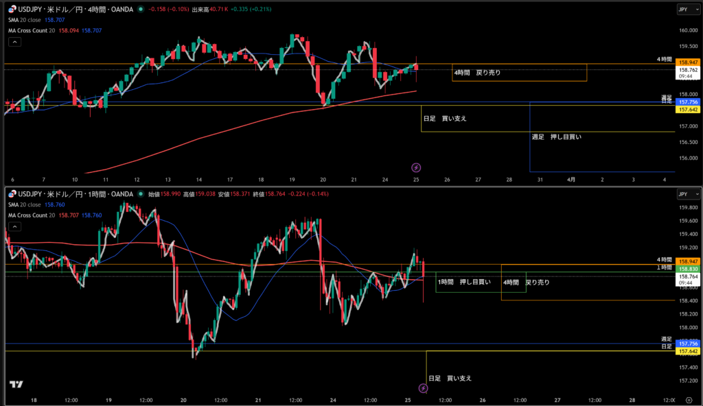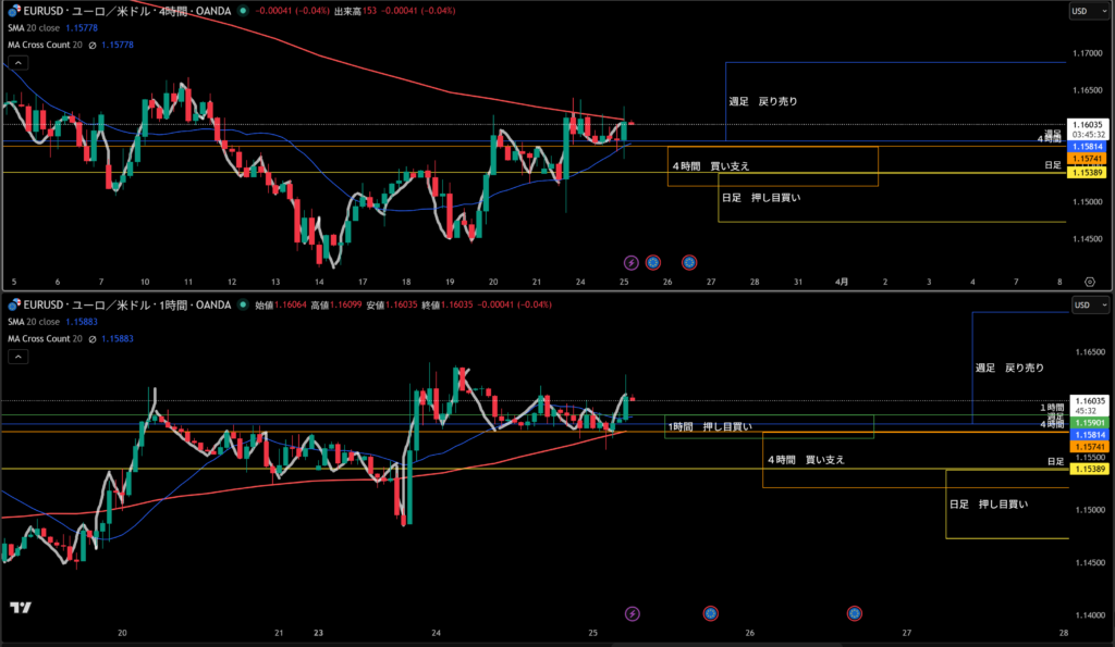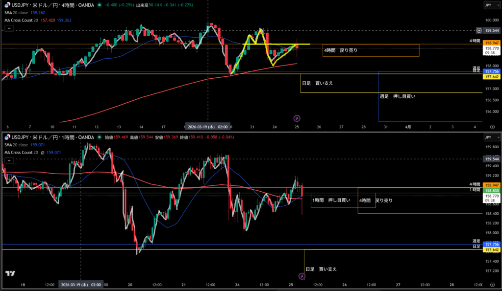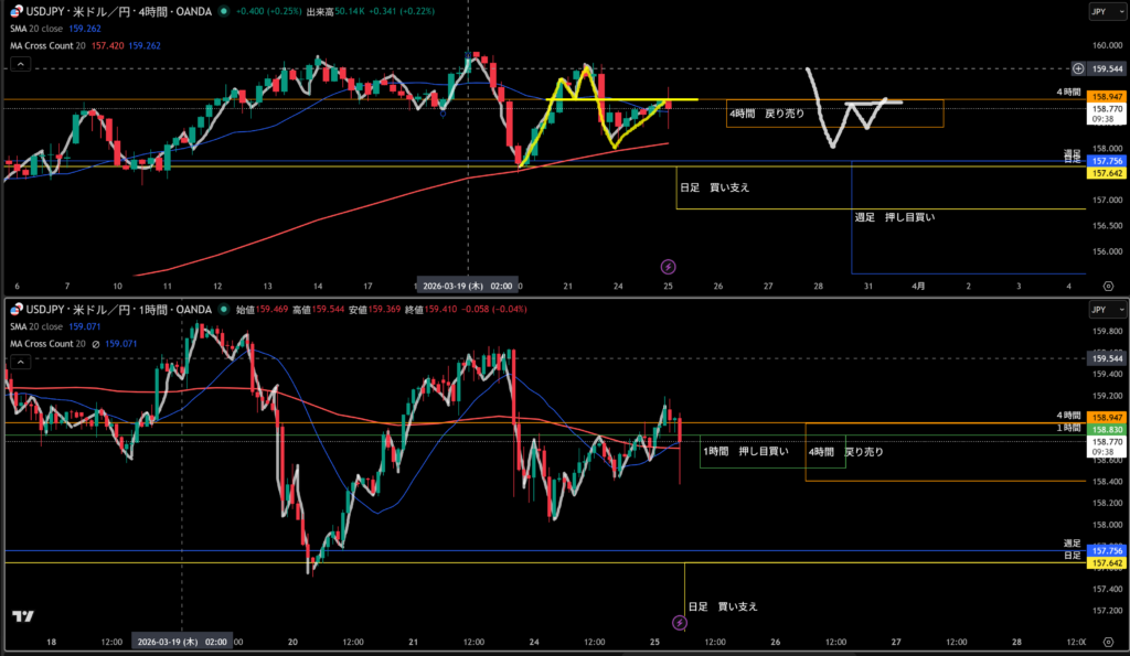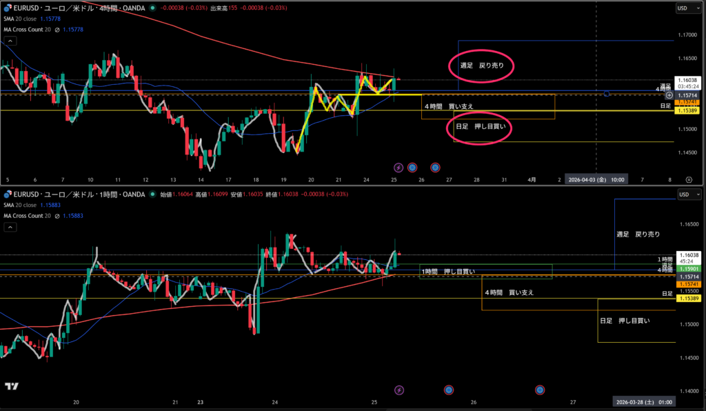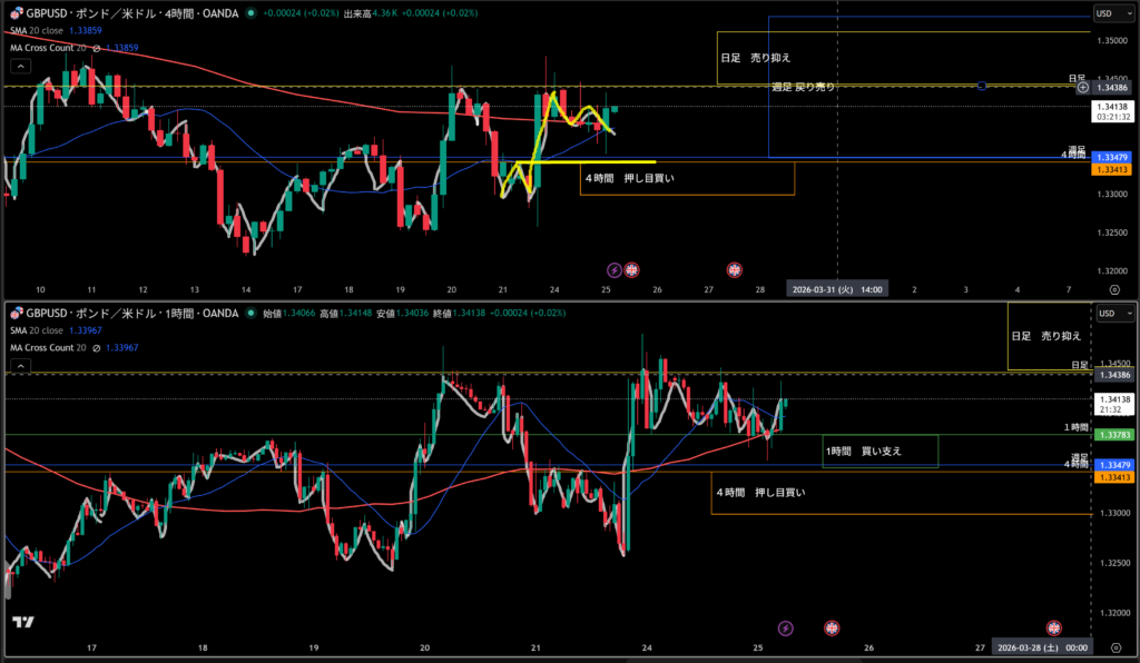 移動平均線は上向き4時間の買い支えとして機能しやすい。