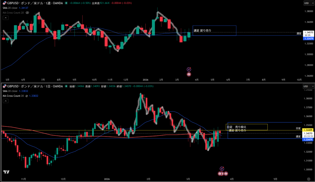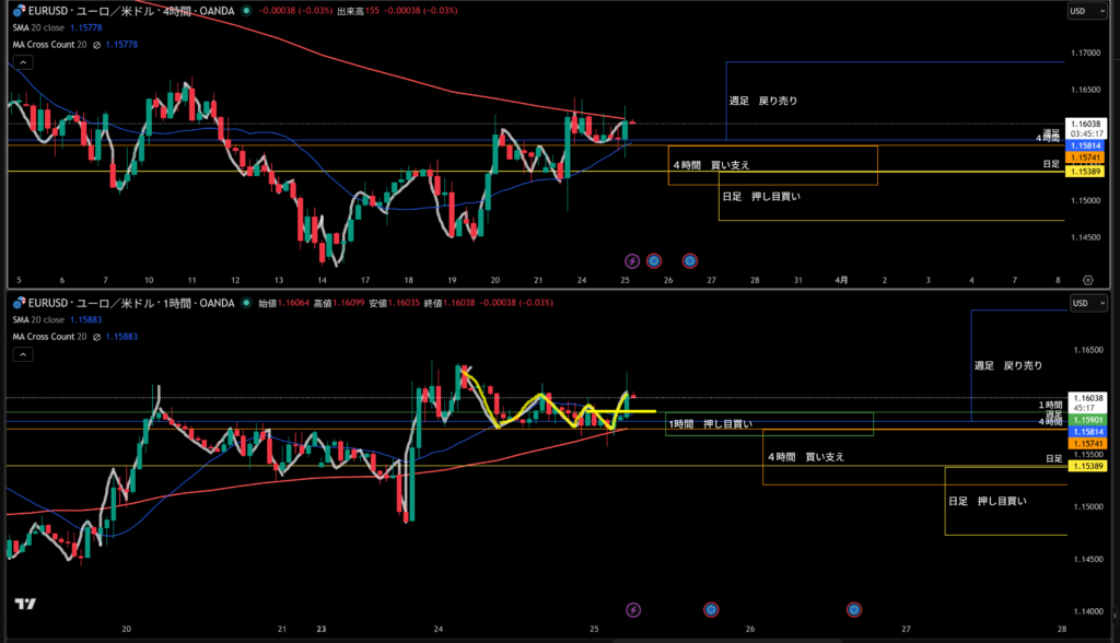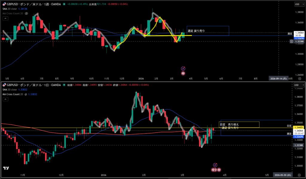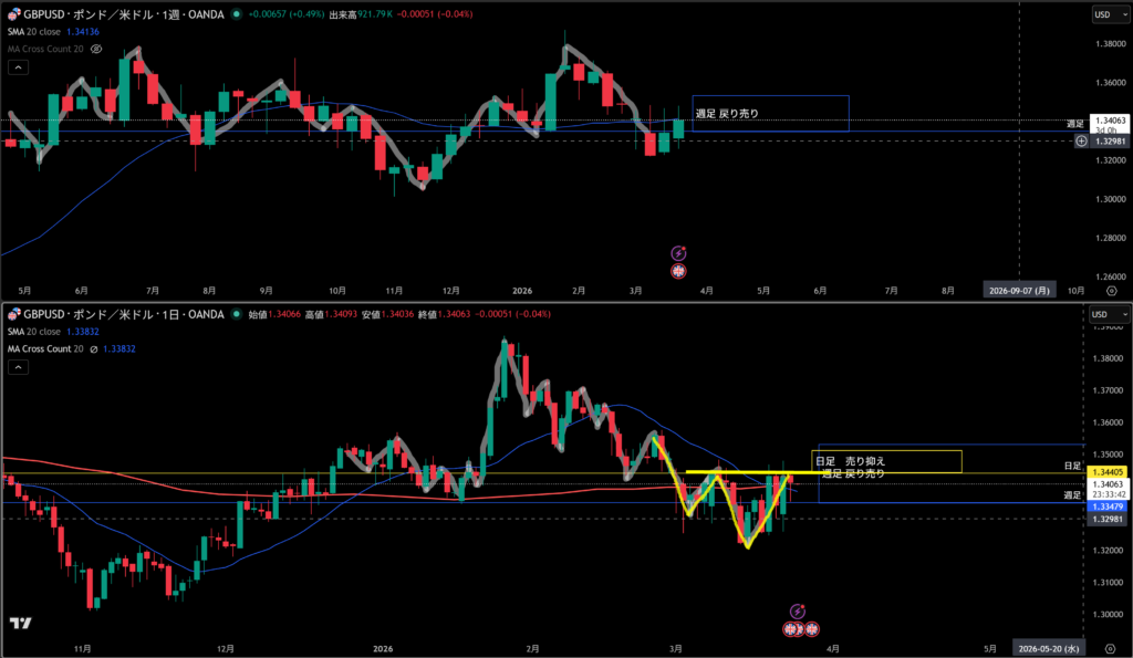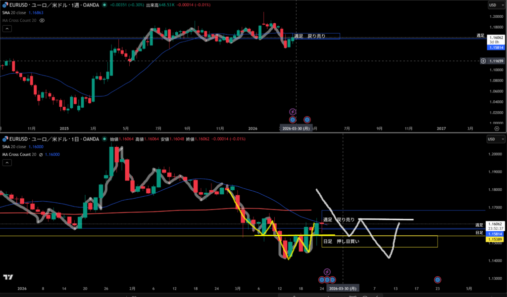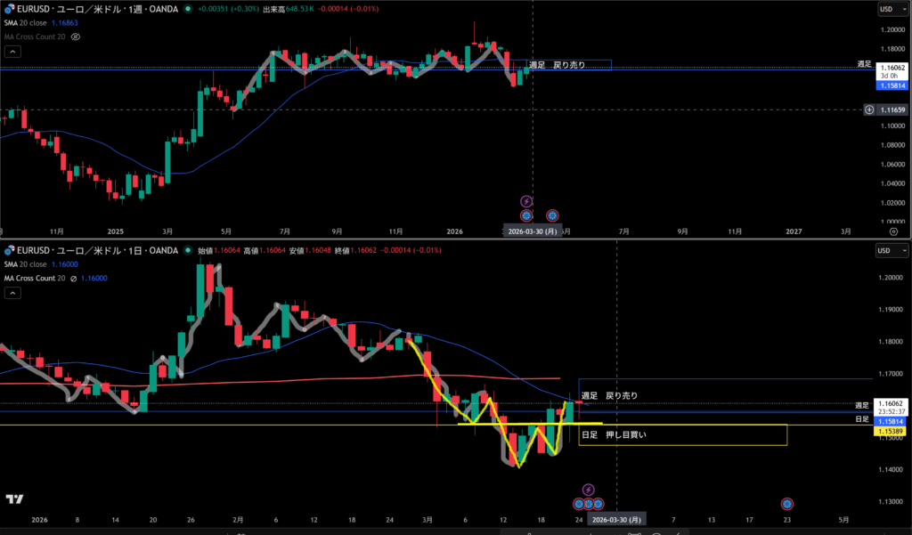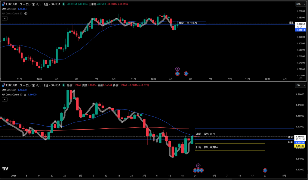 黄色水平線の上に日足の戻り売り勢力がいる。