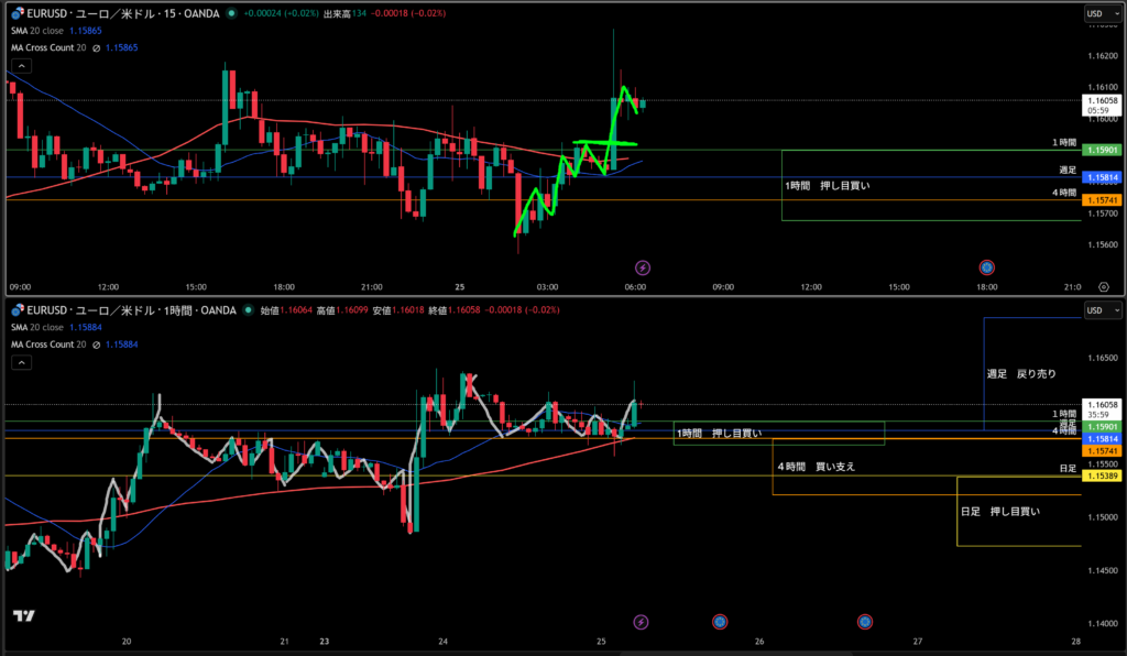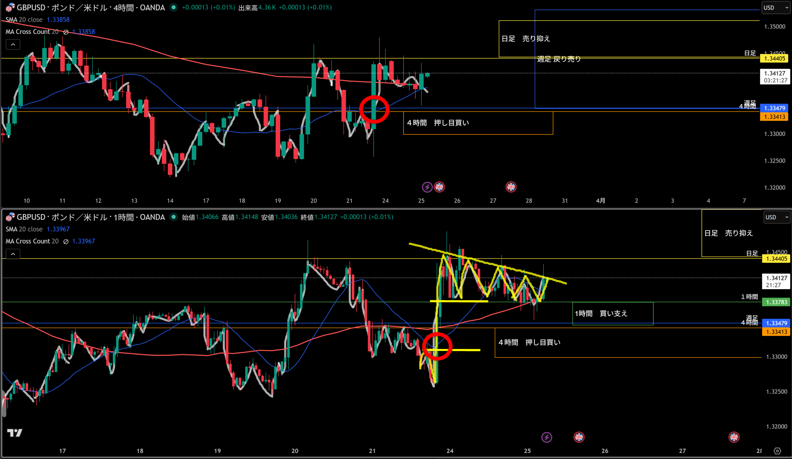 4時間押し目買い勢力エリアと日足押し目買い勢力エリア両方ある!