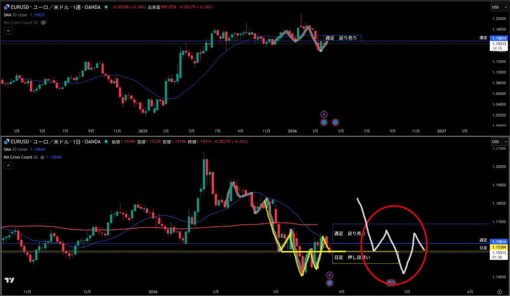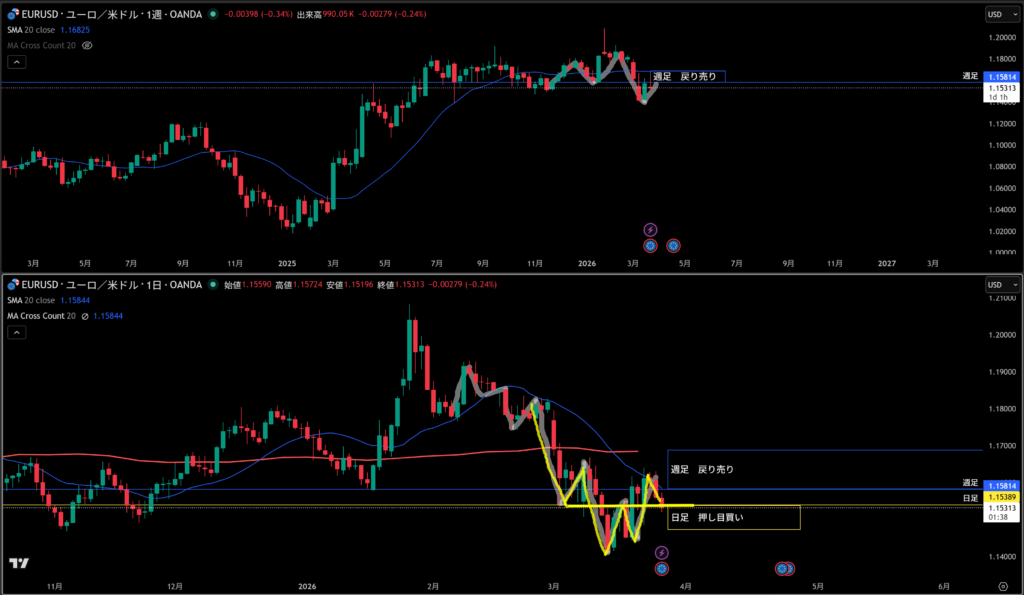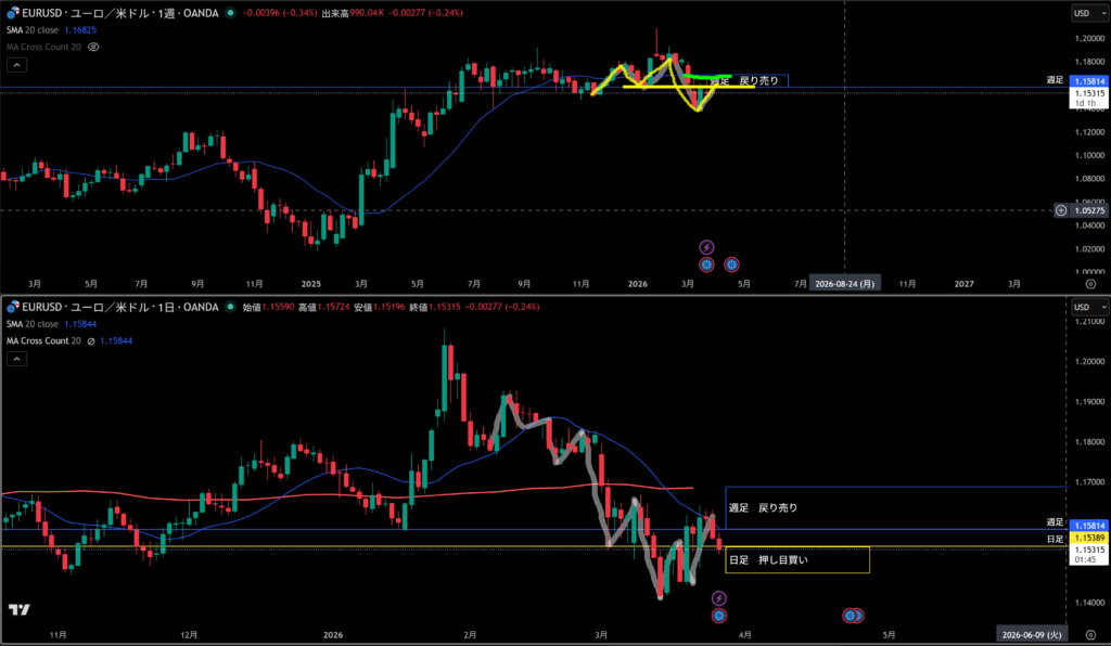 青線水平線の上に週足の戻り売り勢力がいる。