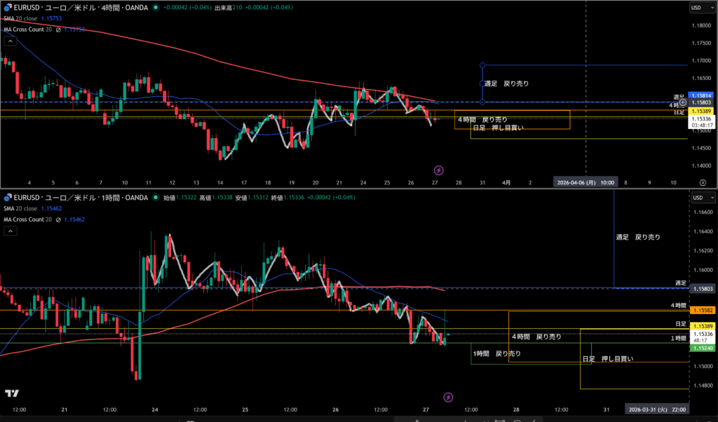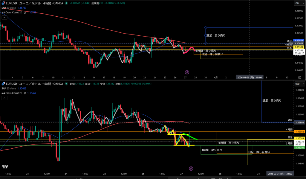 4時間足方向は下。