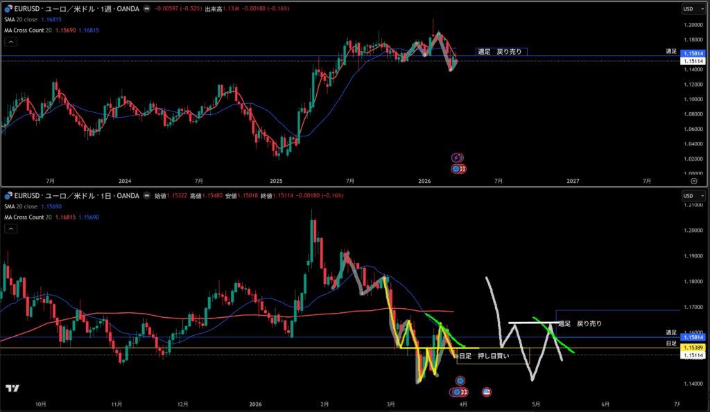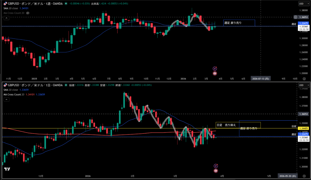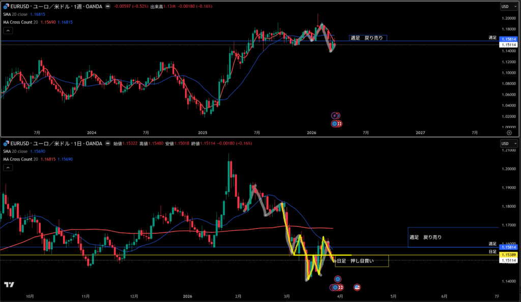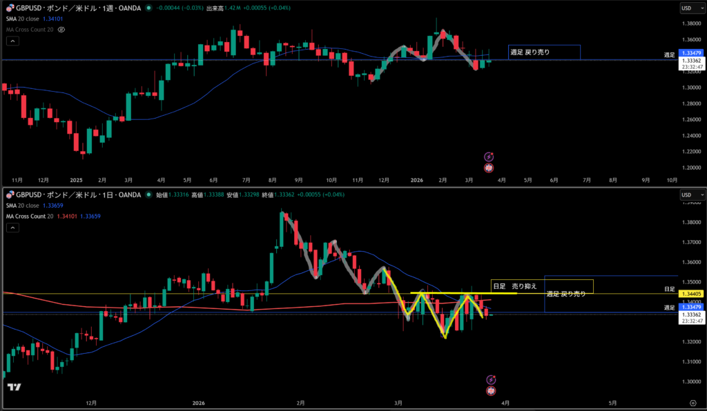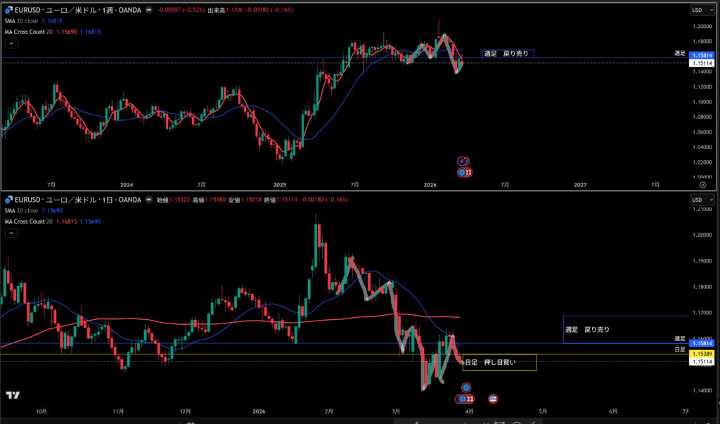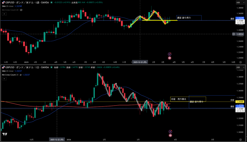 青線水平線の上に週足の戻り売り勢力がいる。