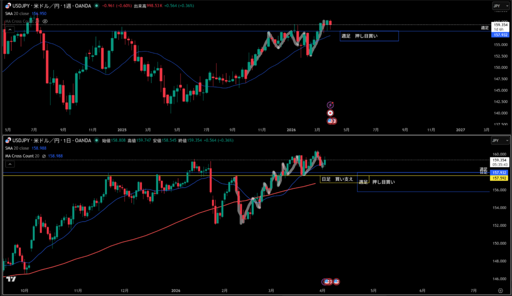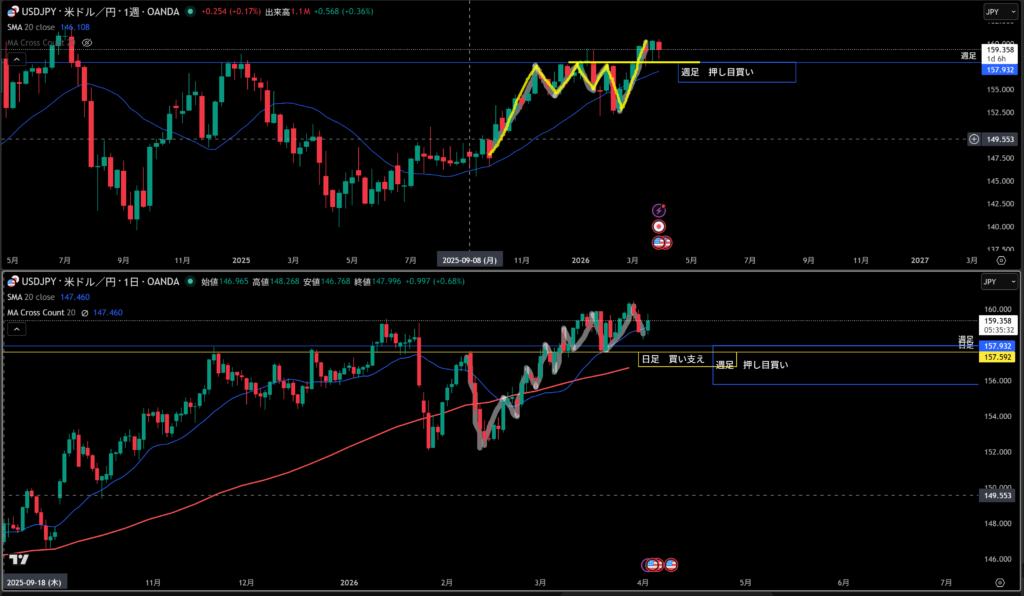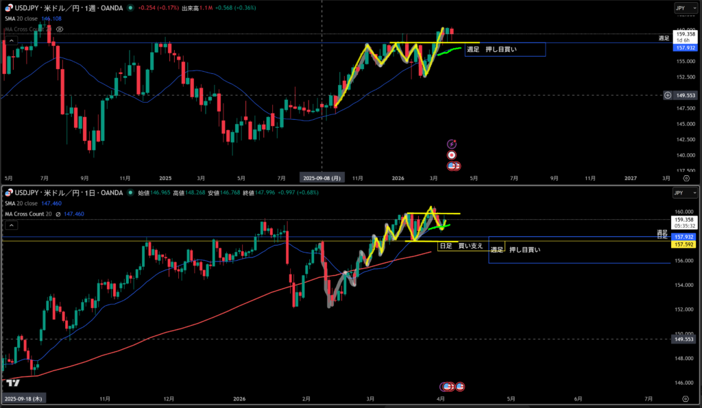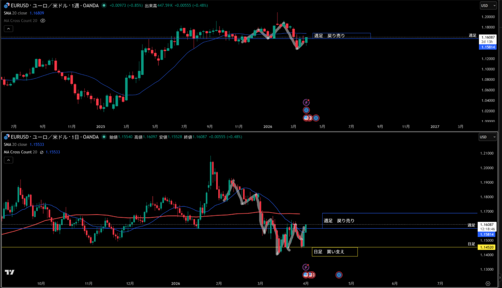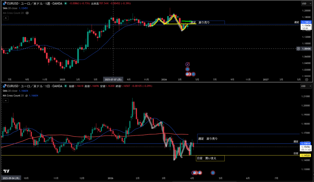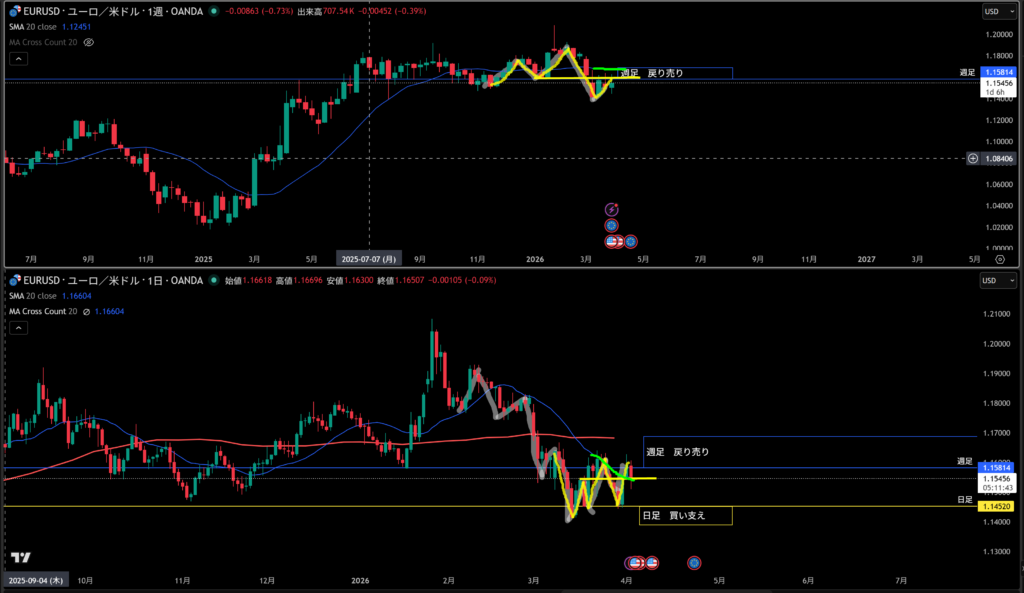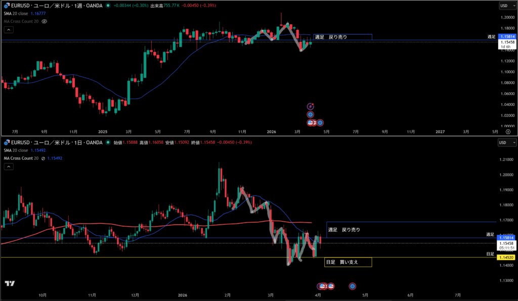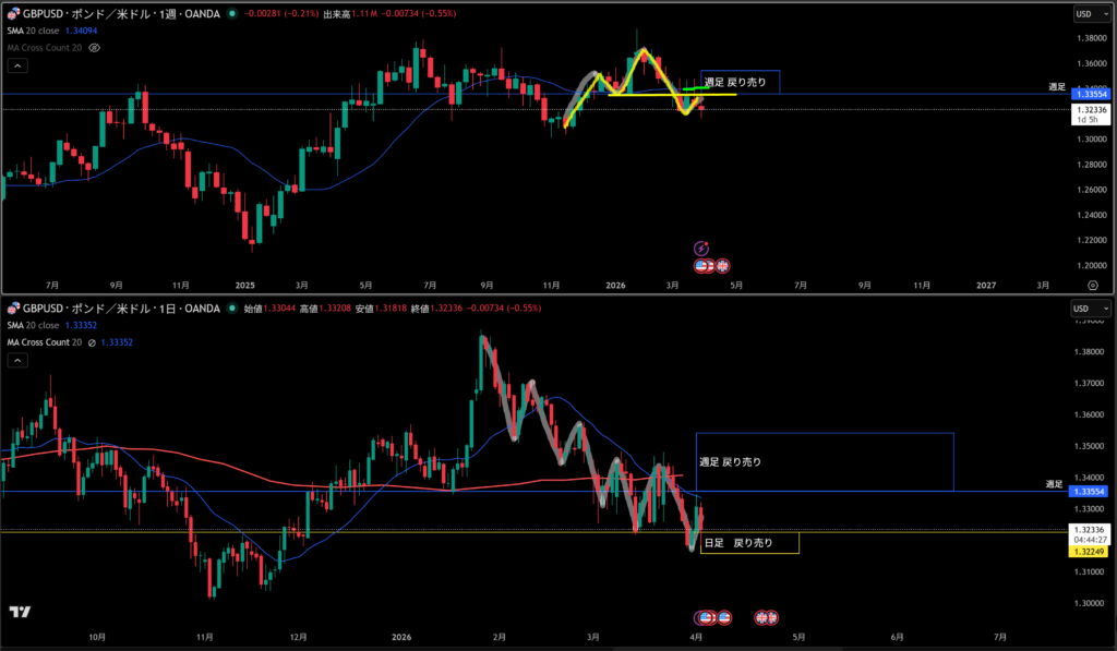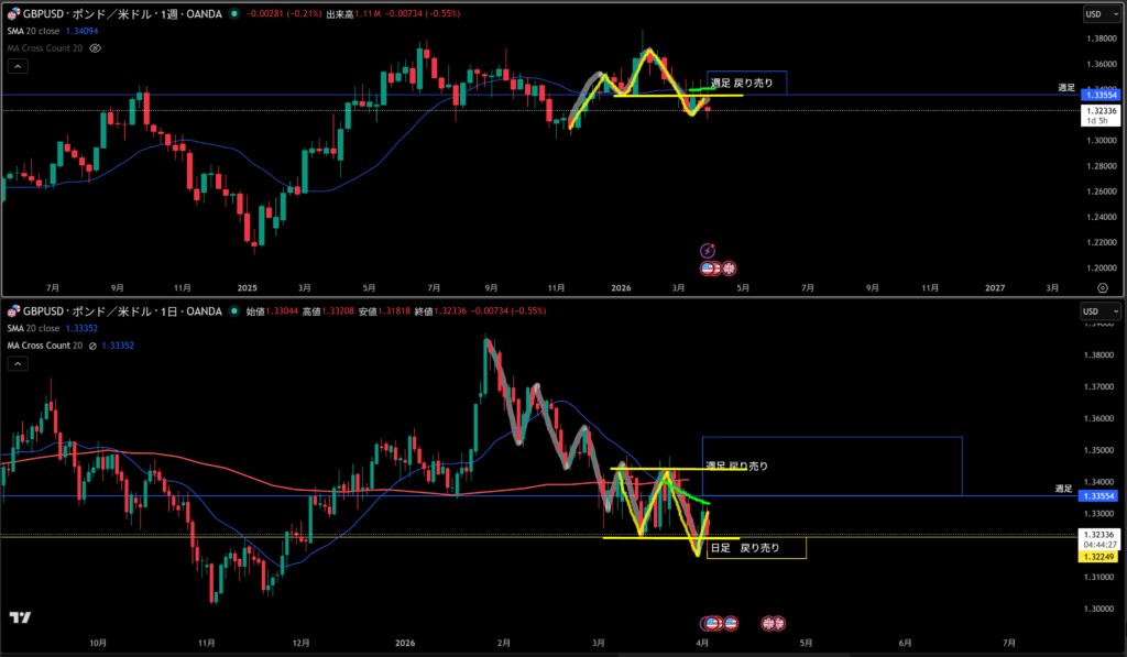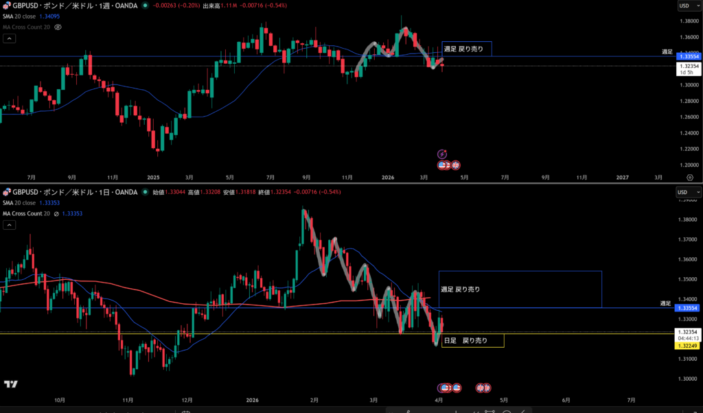 黄色水平線の上に日足の戻り売り勢力がいる。