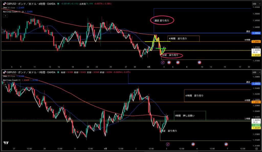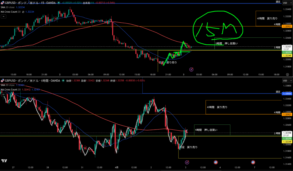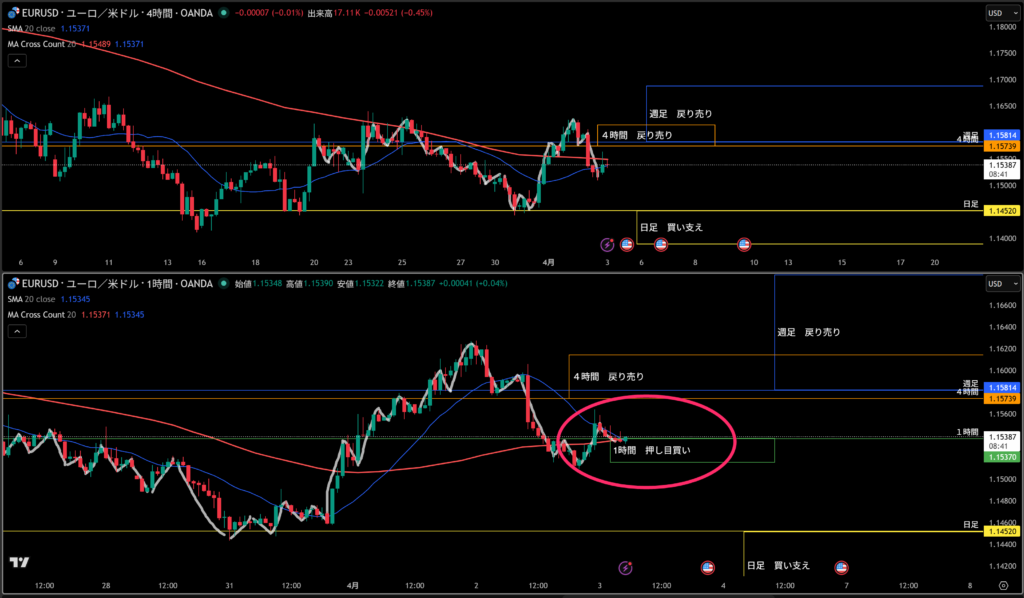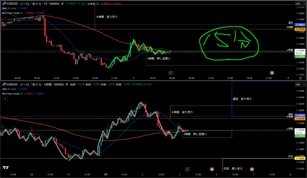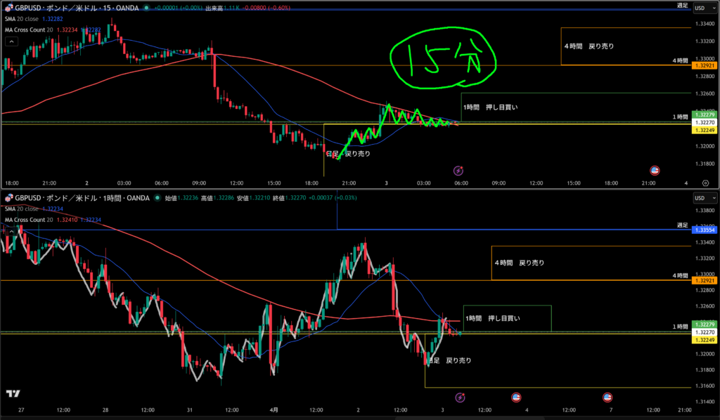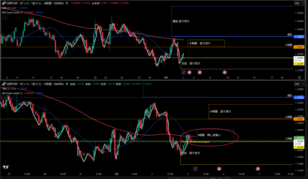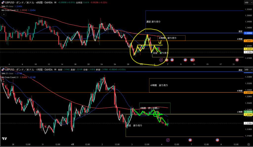 4時間戻り売り勢力下の黄色丸の位置だったかな?