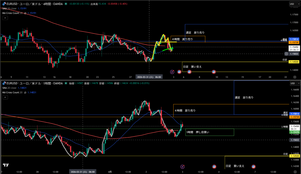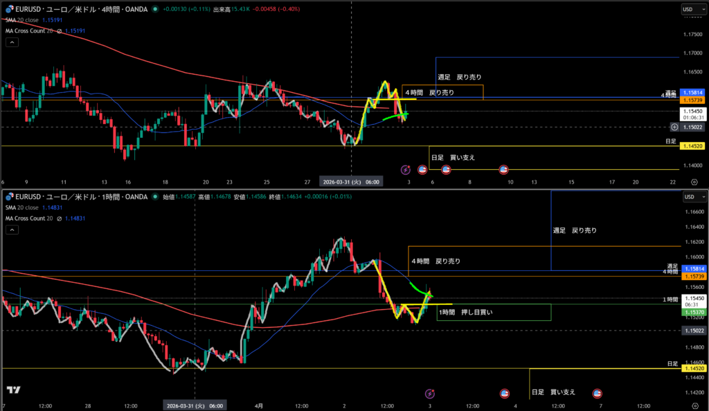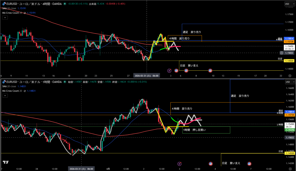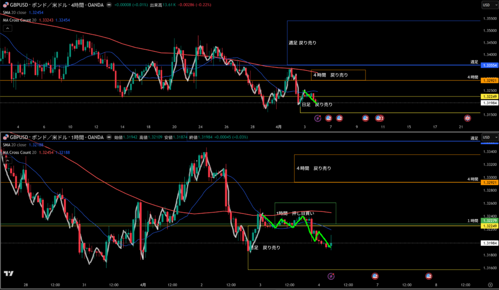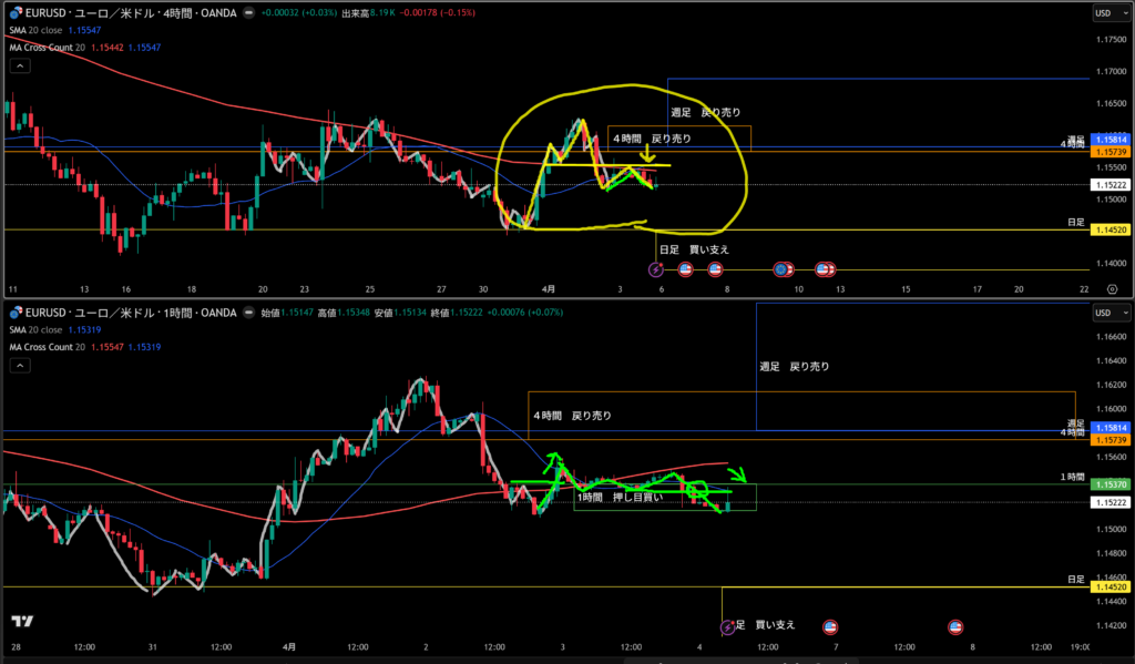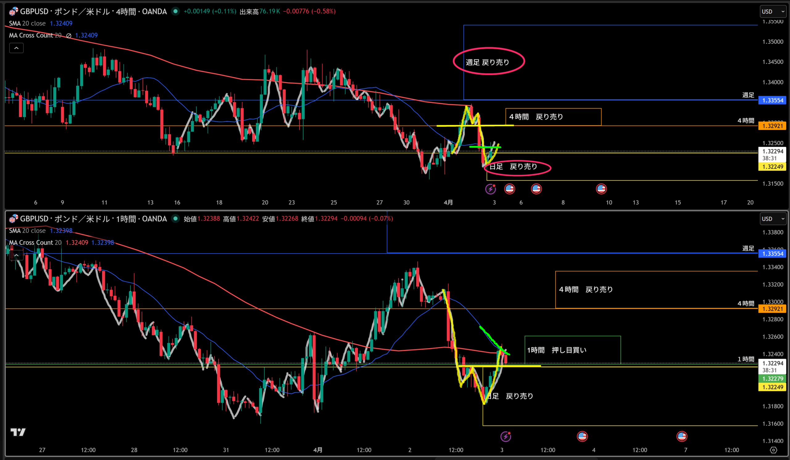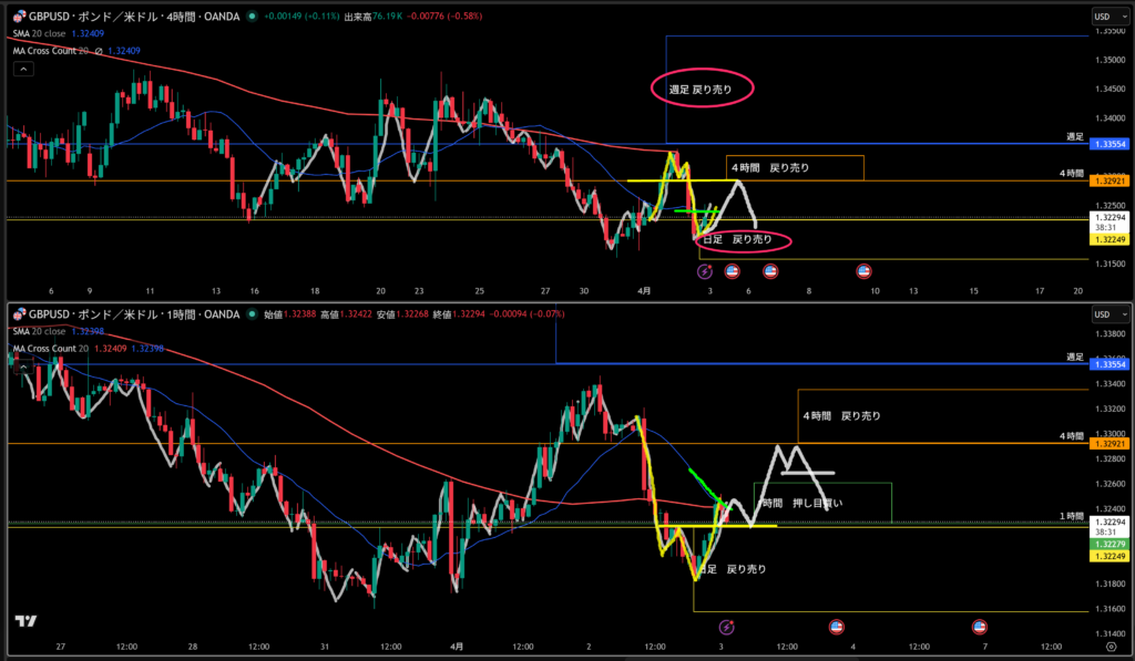 4時間戻り売り勢力下の黄色丸の位置だったかな?