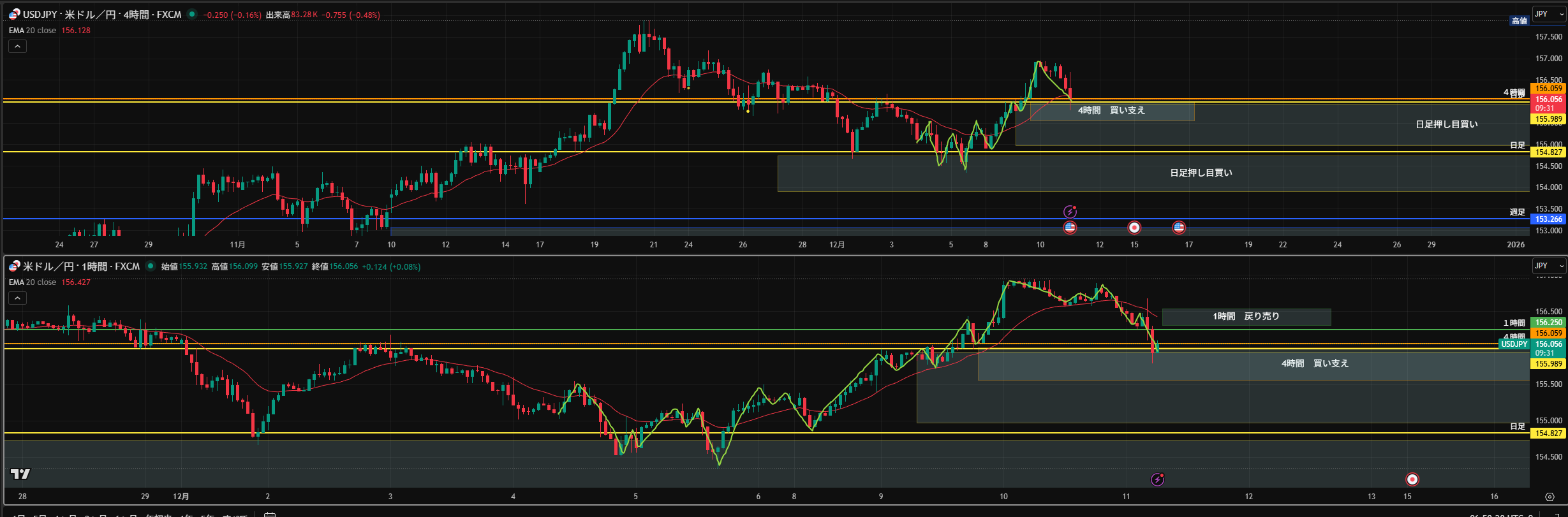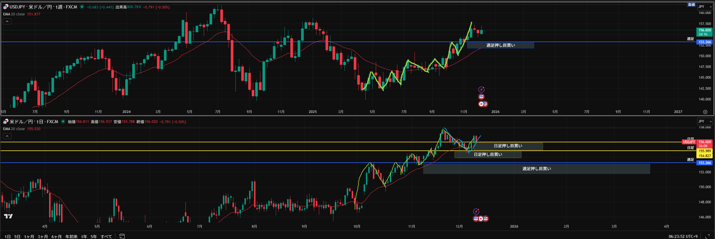 黄色水平線: 下に押し目買い勢力