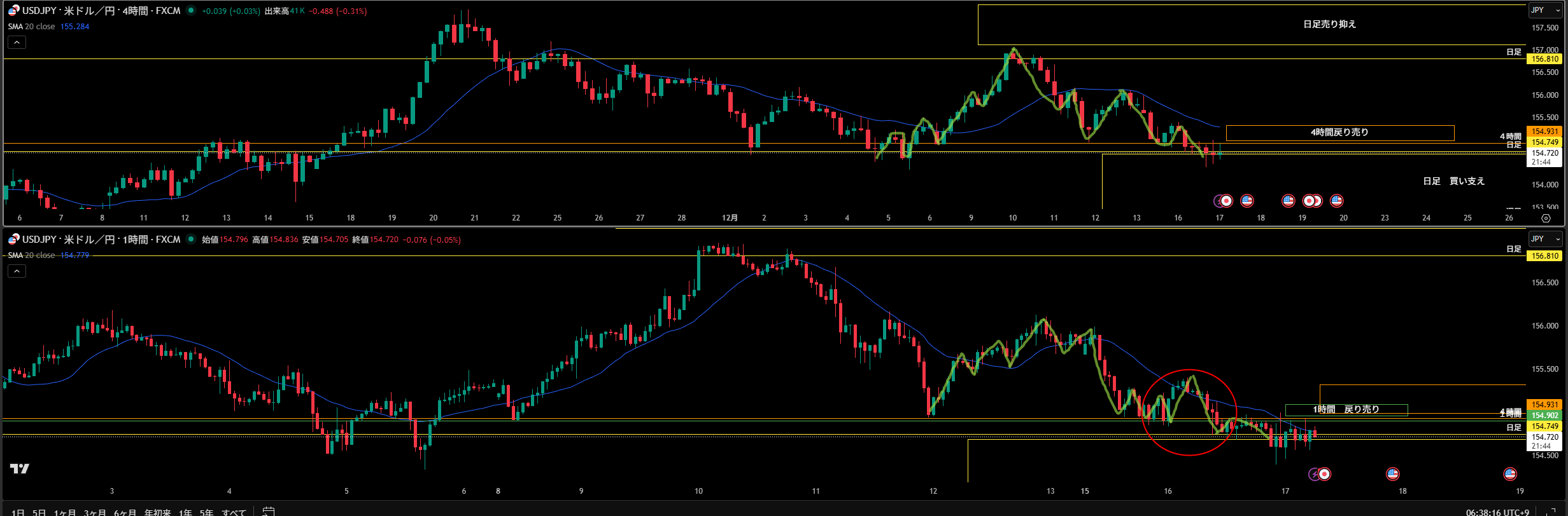 4時間足 方向 下 下落 波の途中