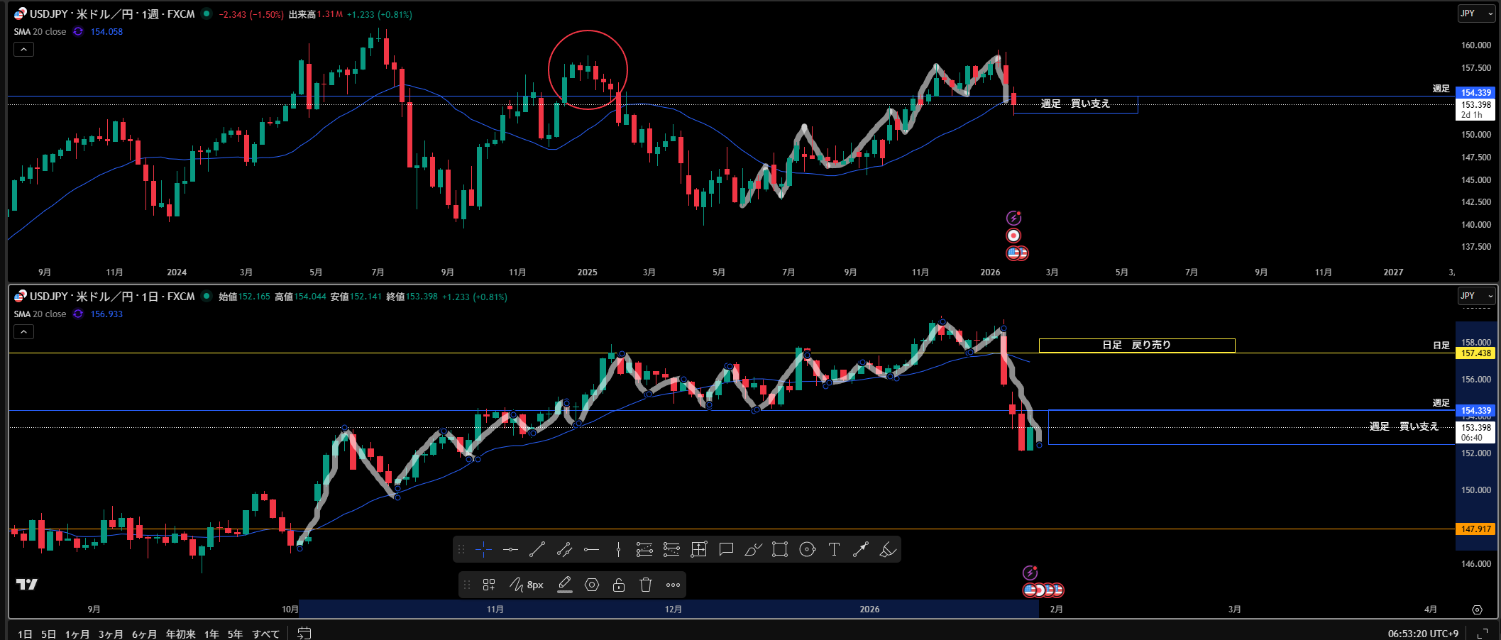 ロウソク足に横から突き刺さっている。どう機能してくるか分からないがロウソク足がこの移動平均線の下で確定した来たら売り抑えとして機能しやすい。