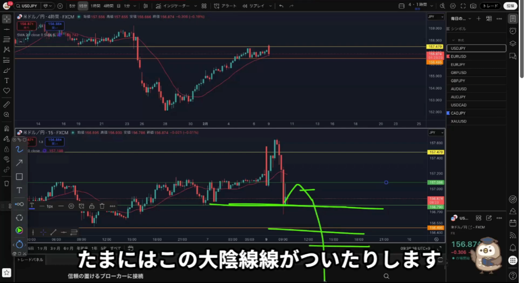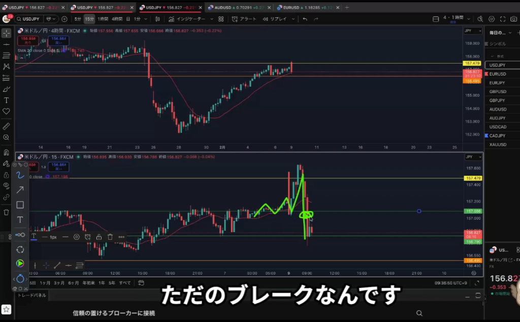4時間足の現在のロウソク足の上には4時間の移動平均線、4時間の戻り売りの水平線、日足の戻り売りの勢力がいる。もりもりになんかいる!